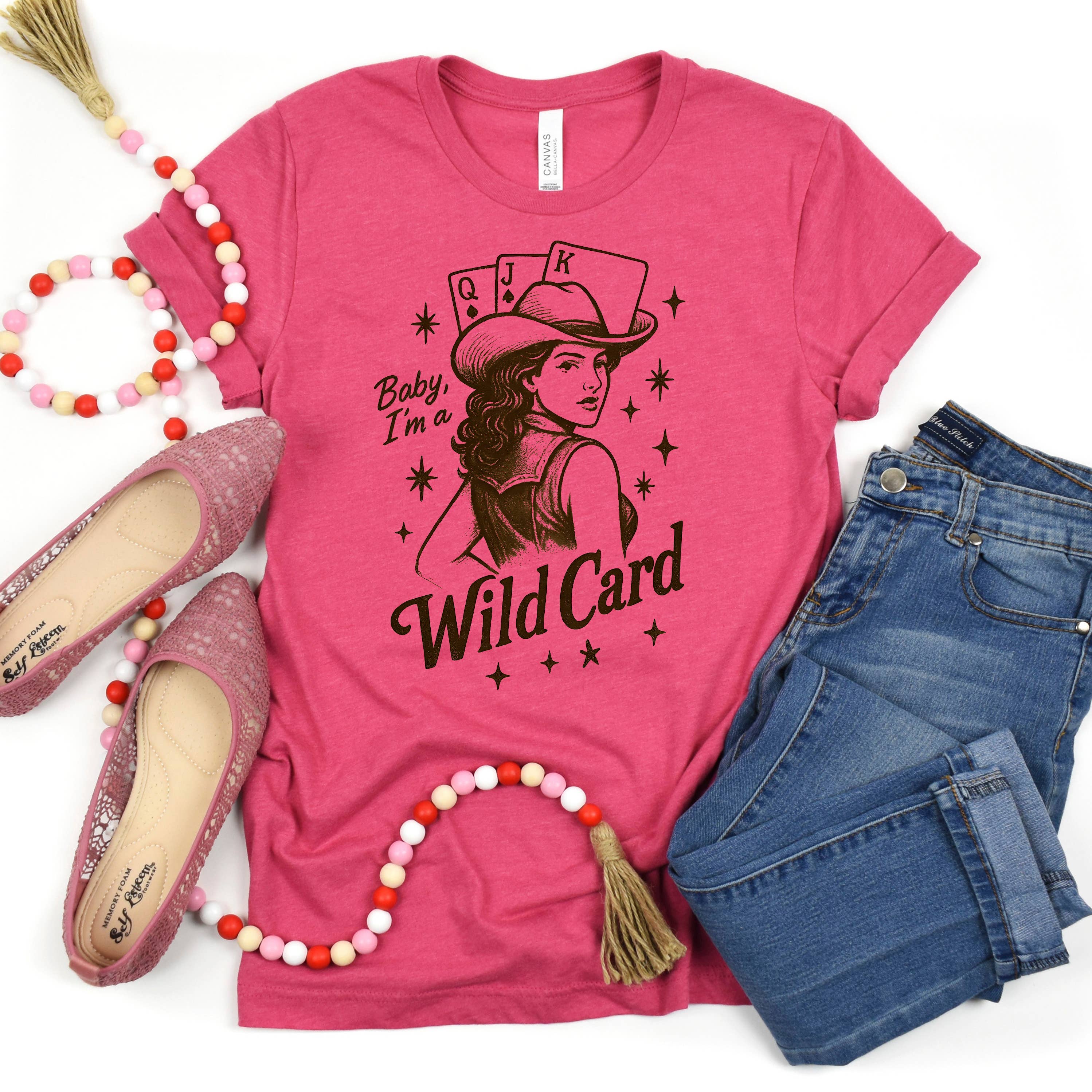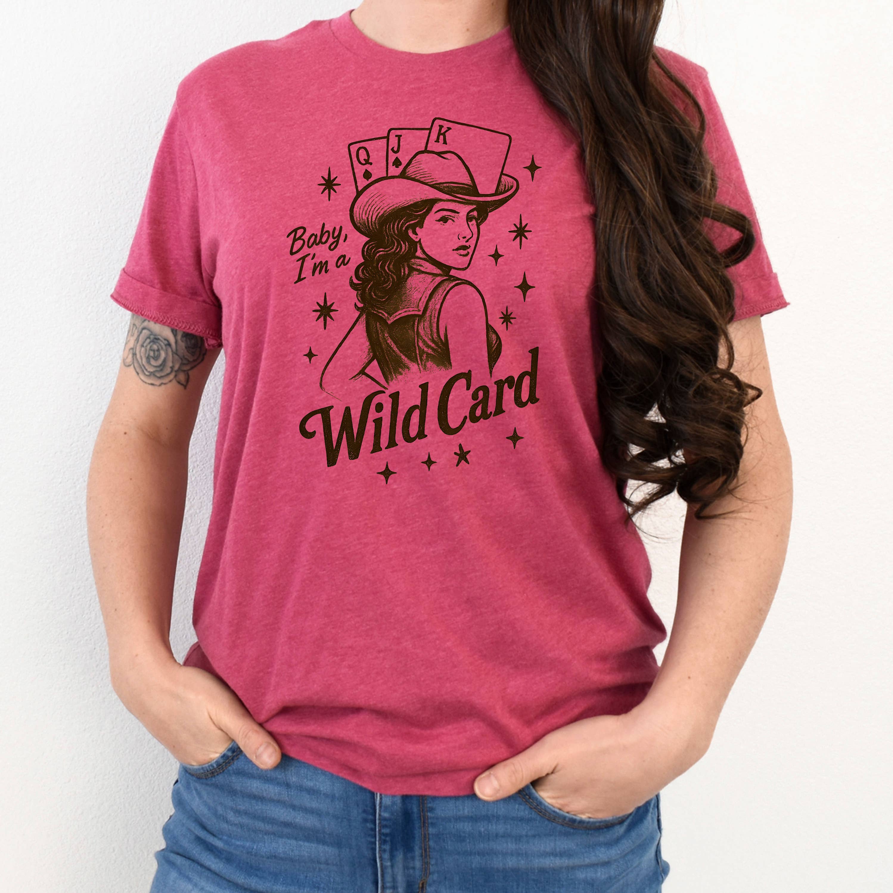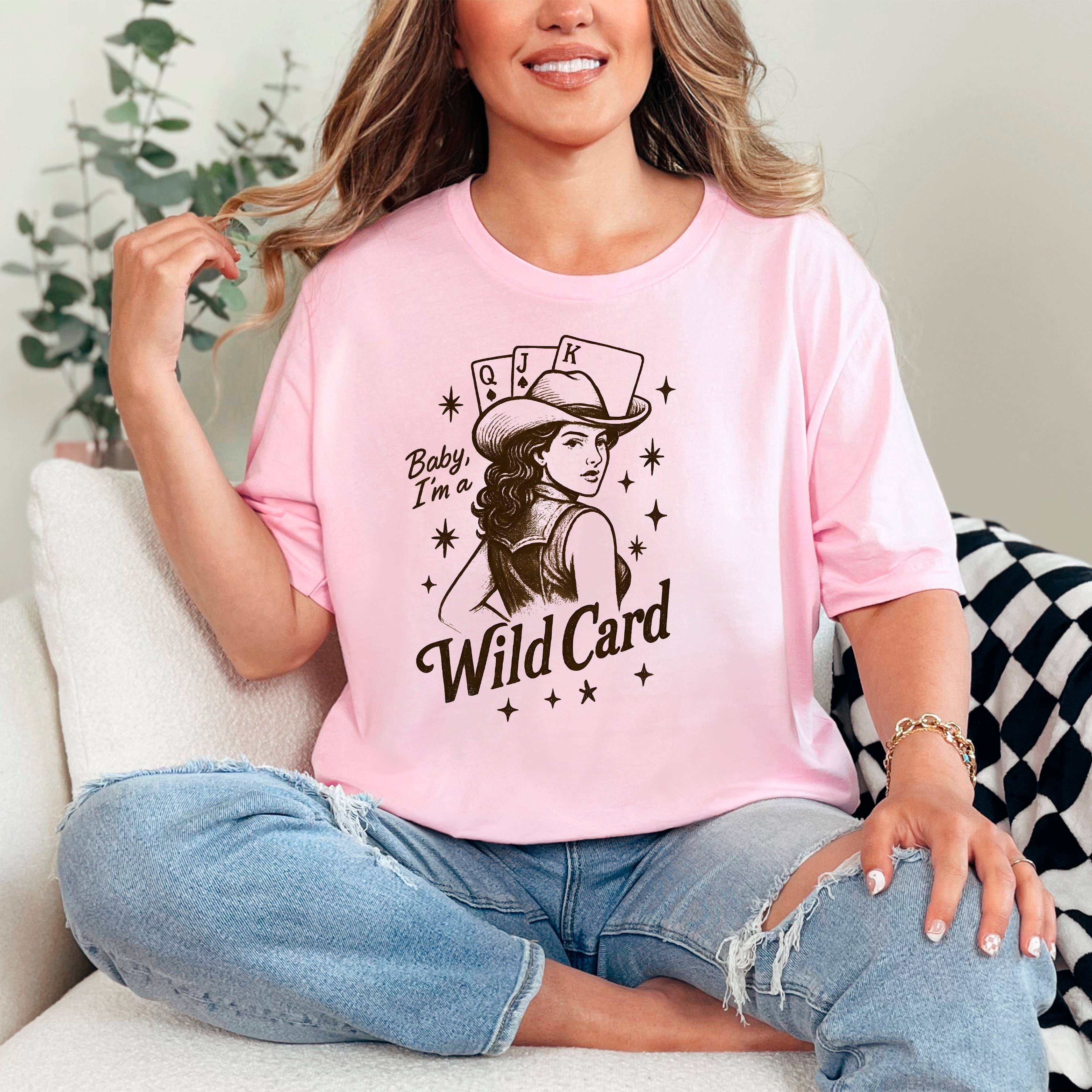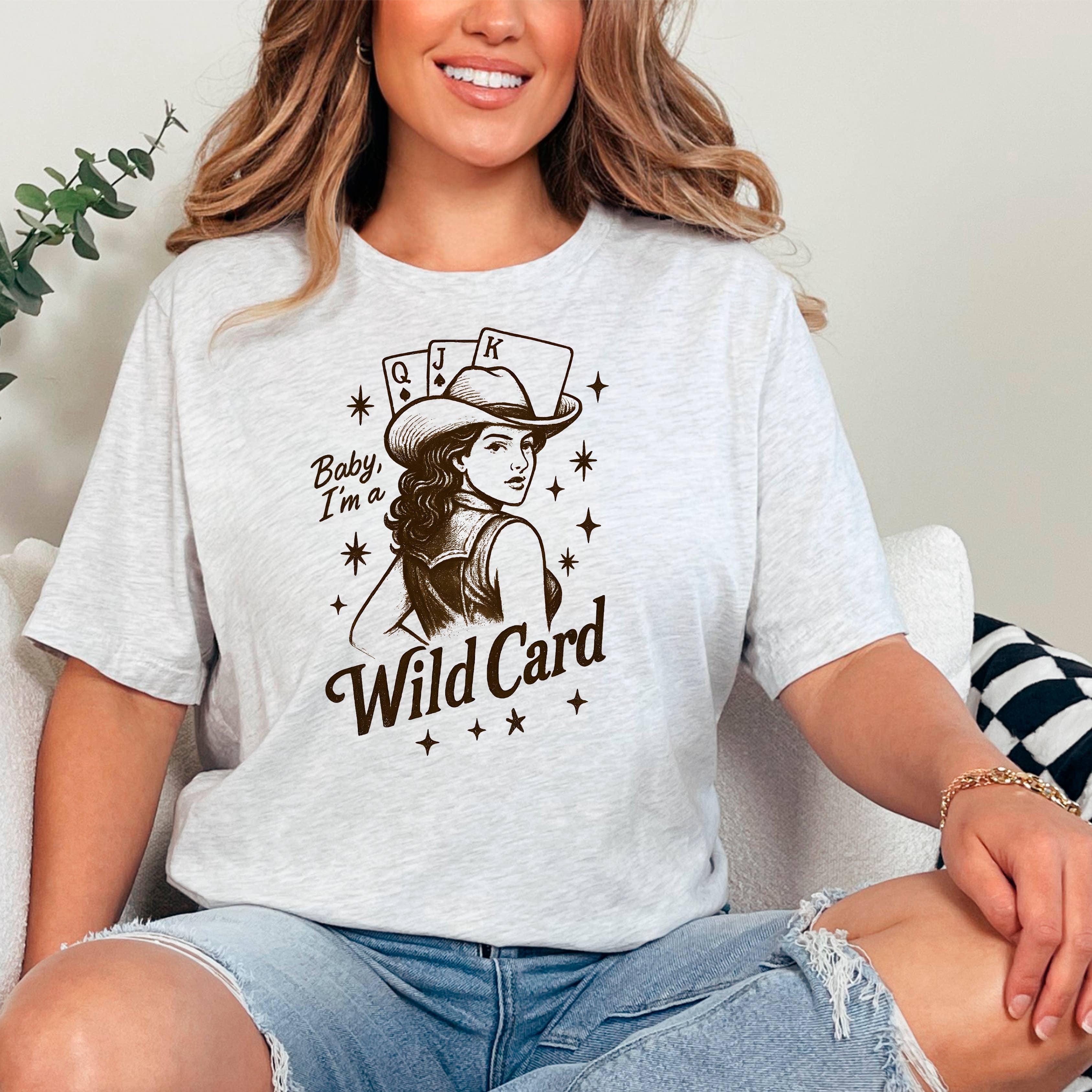 Deal your customers a winning hand with the "Baby, I'm a Wild Card" graphic tee. This design taps into the trending Western and Coastal Cowgirl aesthetics, featuring a vintage-inspired pin-up cowgirl, playing cards, and retro starbursts. Printed on the premium Bella + Canvas 3001, this tee offers the retail-quality softness and relaxed fit that boutique shoppers love.