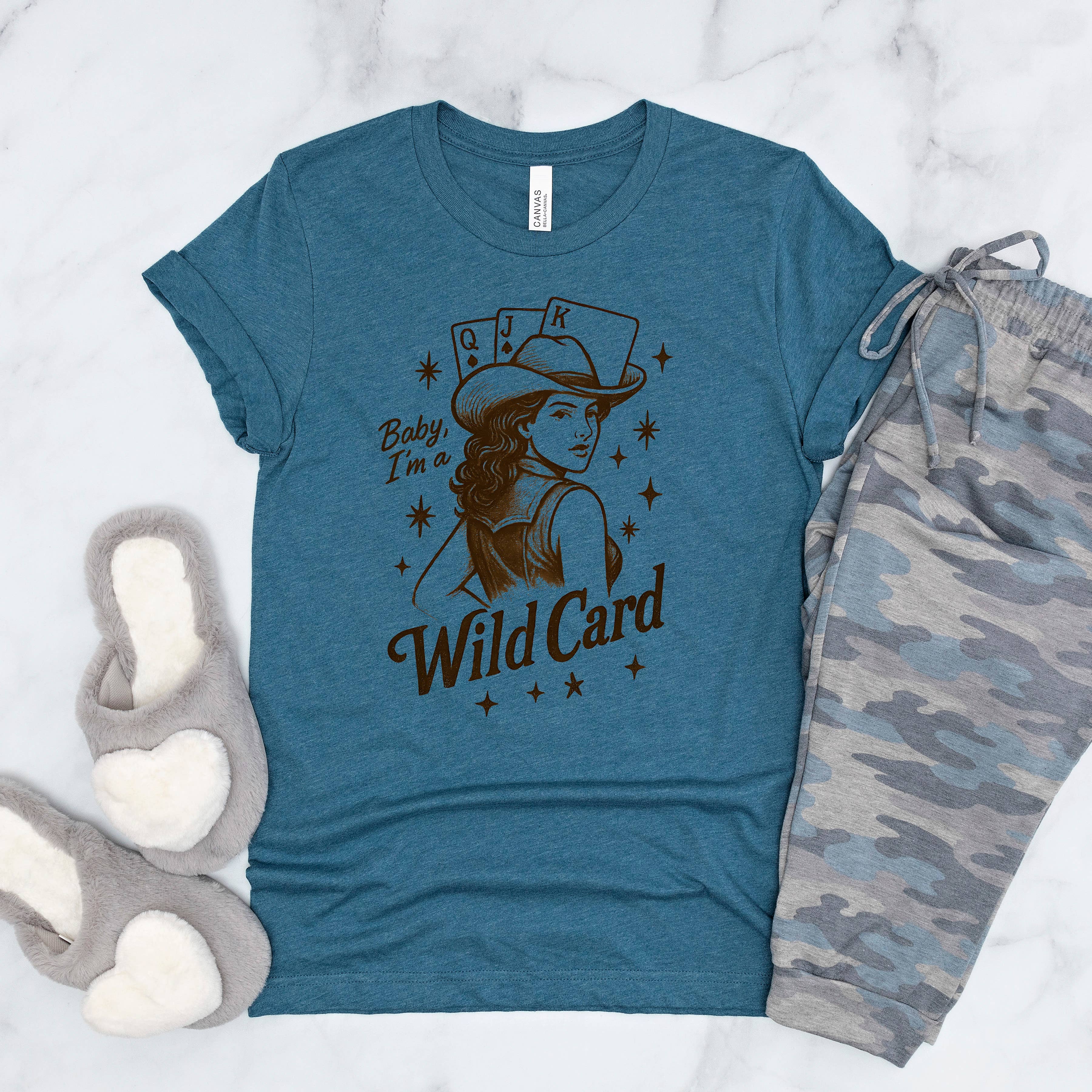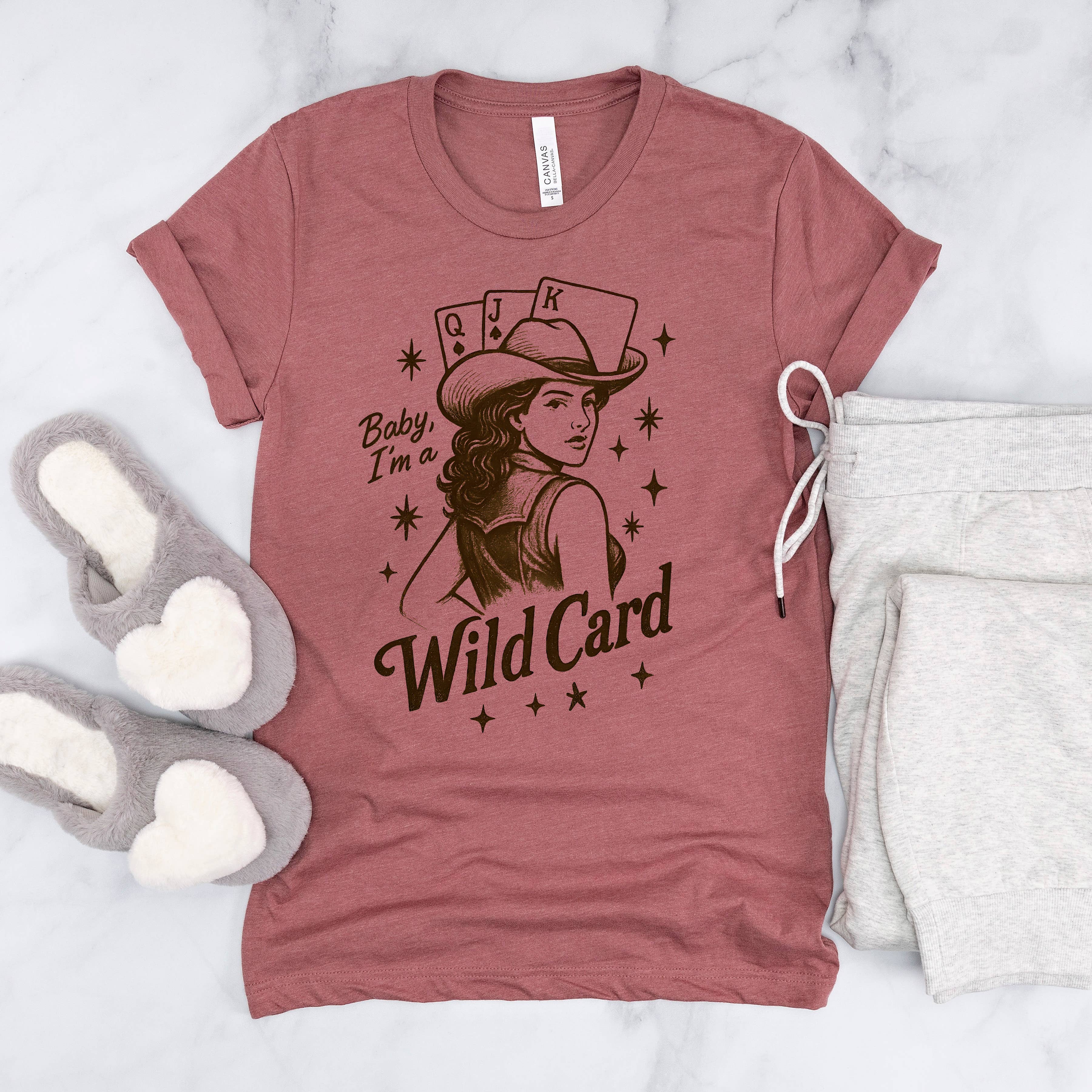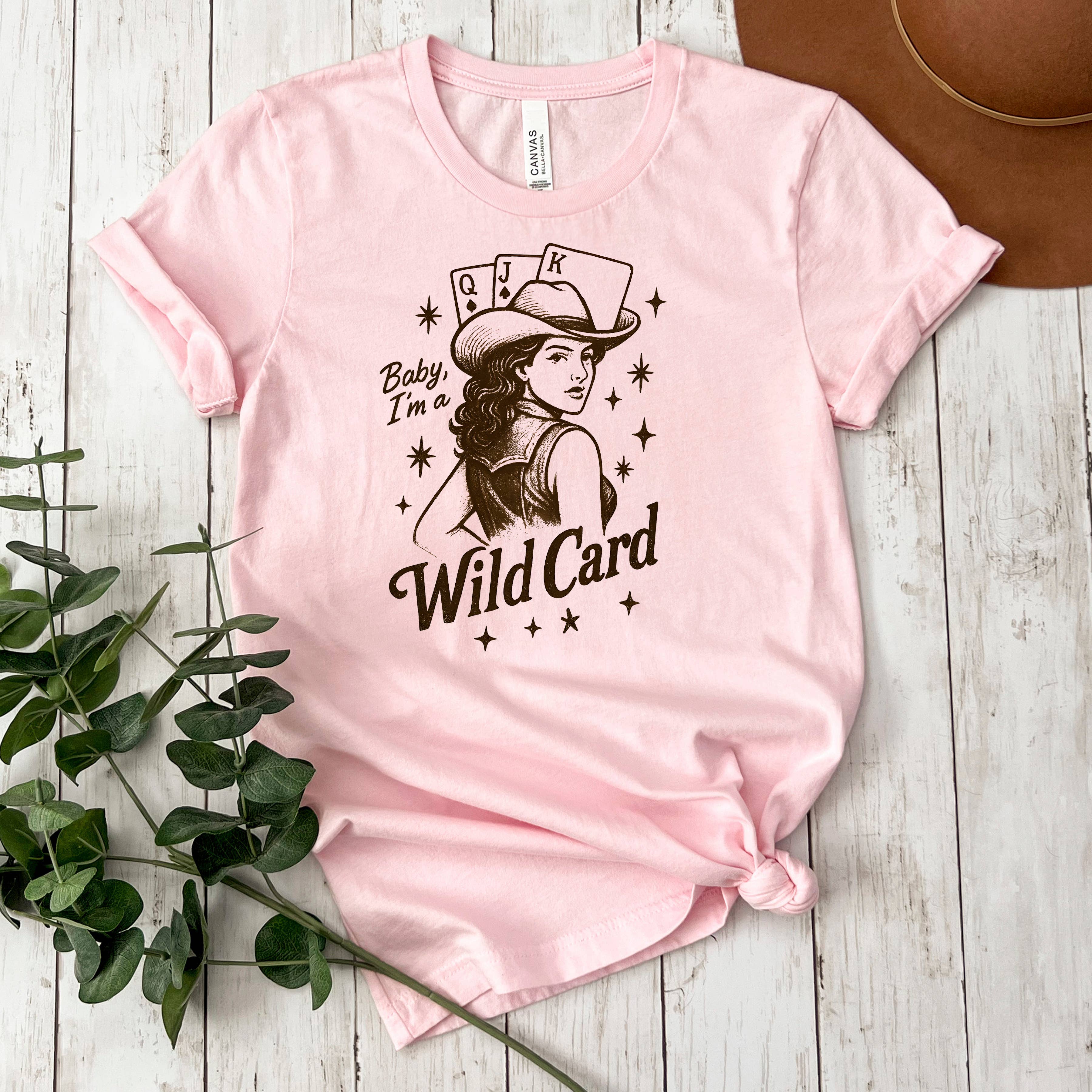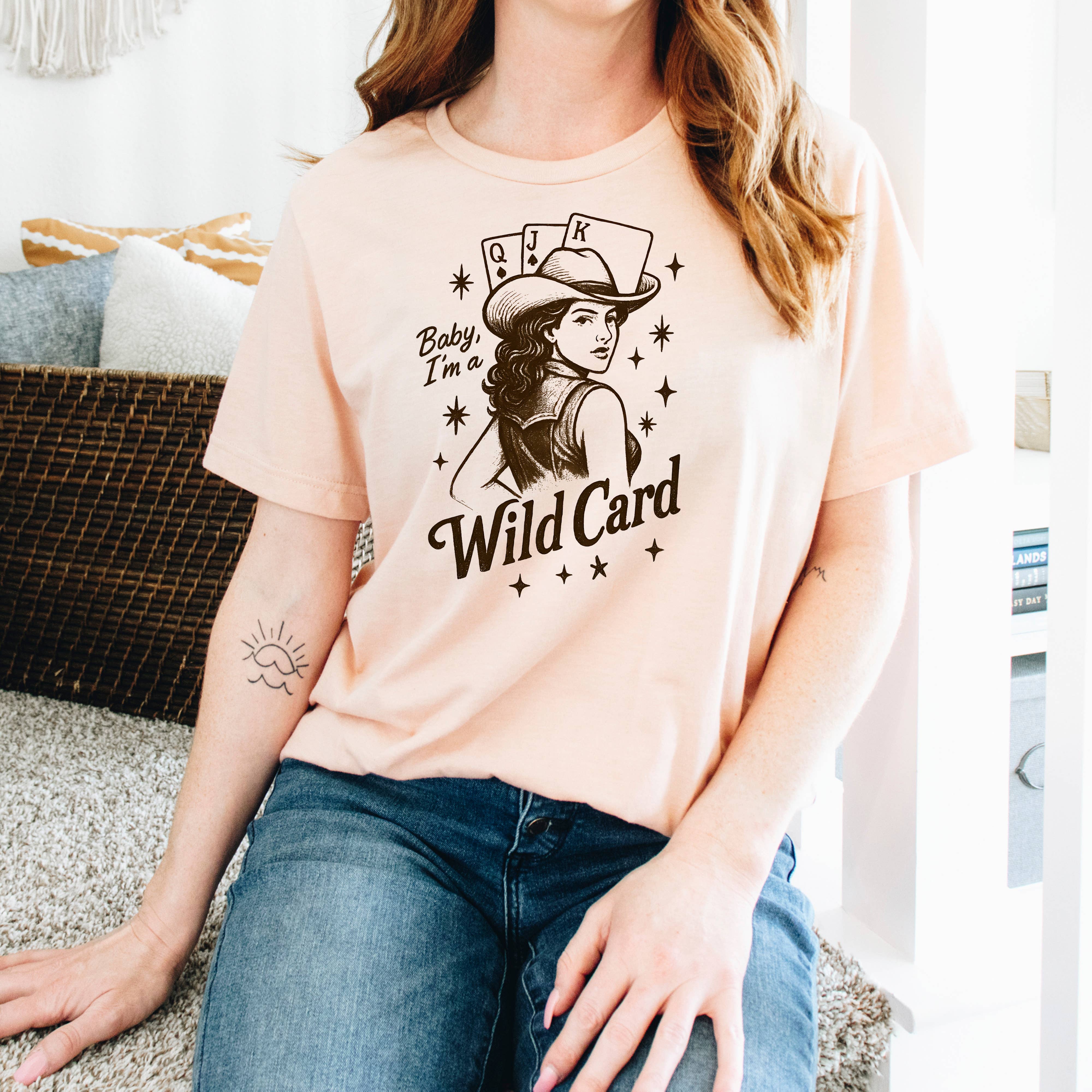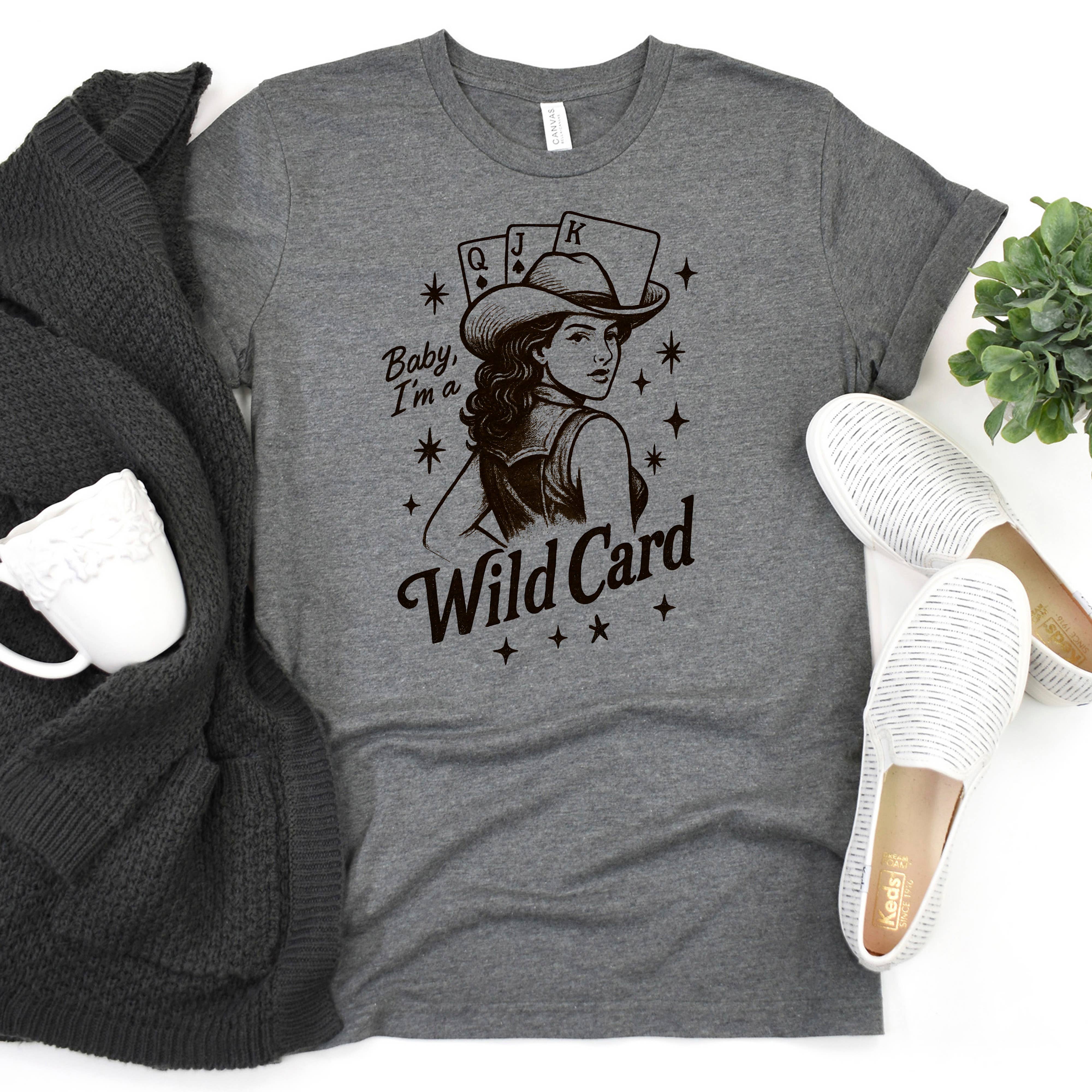 Design: "Baby, I'm a Wild Card" with vintage western illustration.