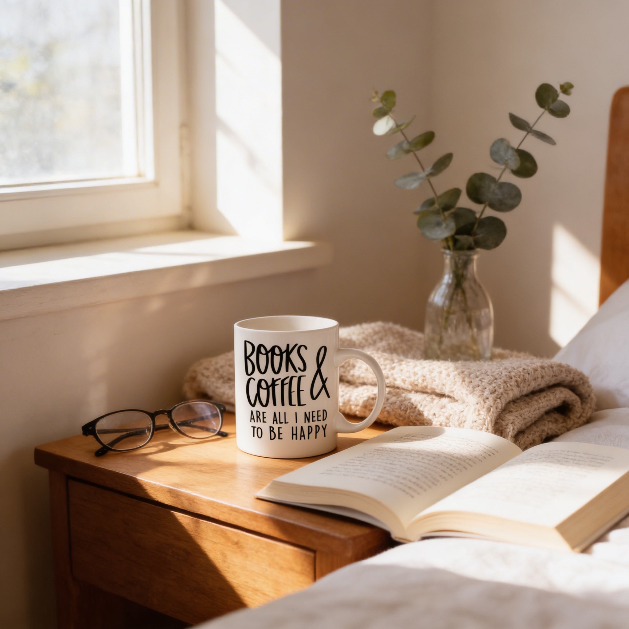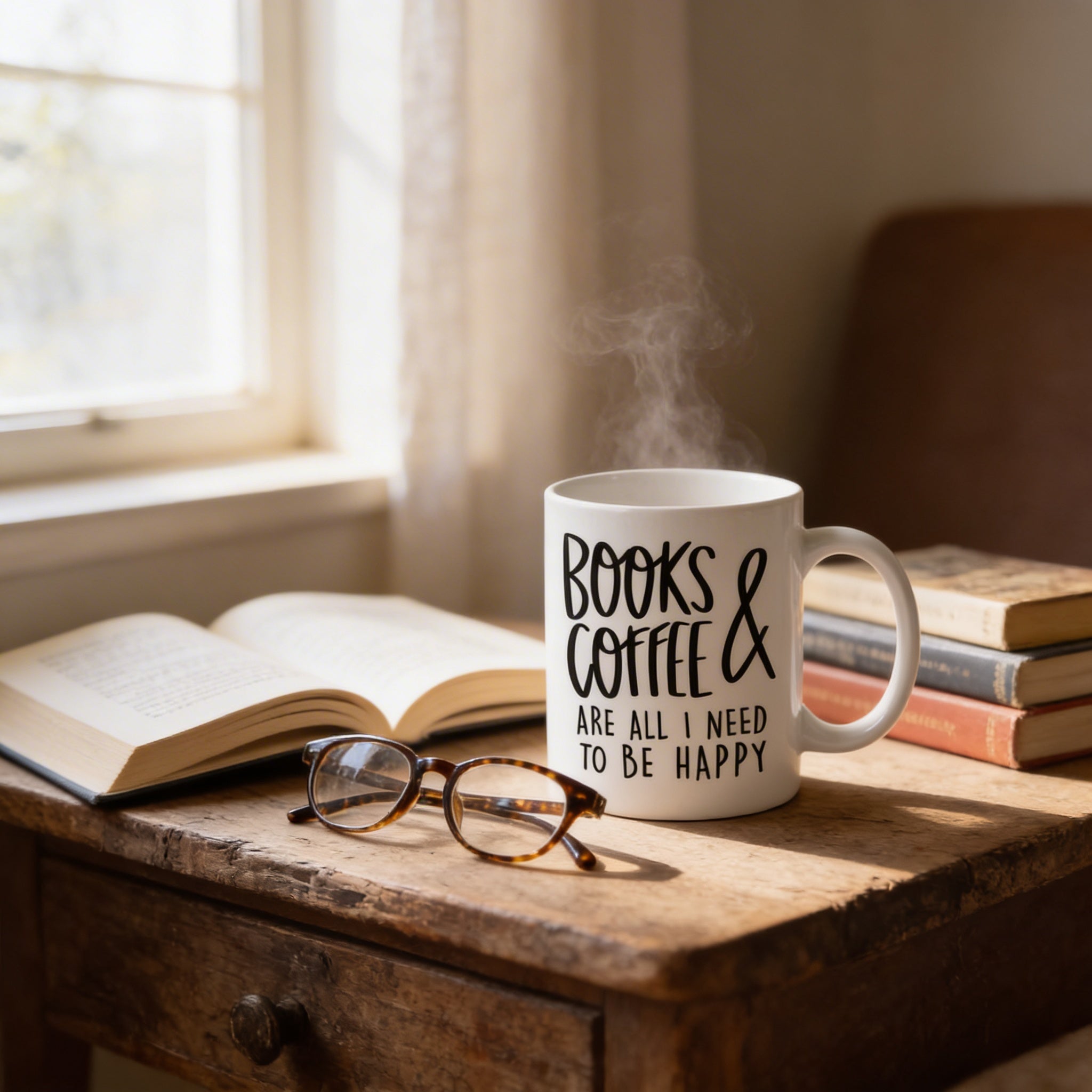 - Double-sided print showcasing the witty "Books & Coffee are all I need to be happy" design
