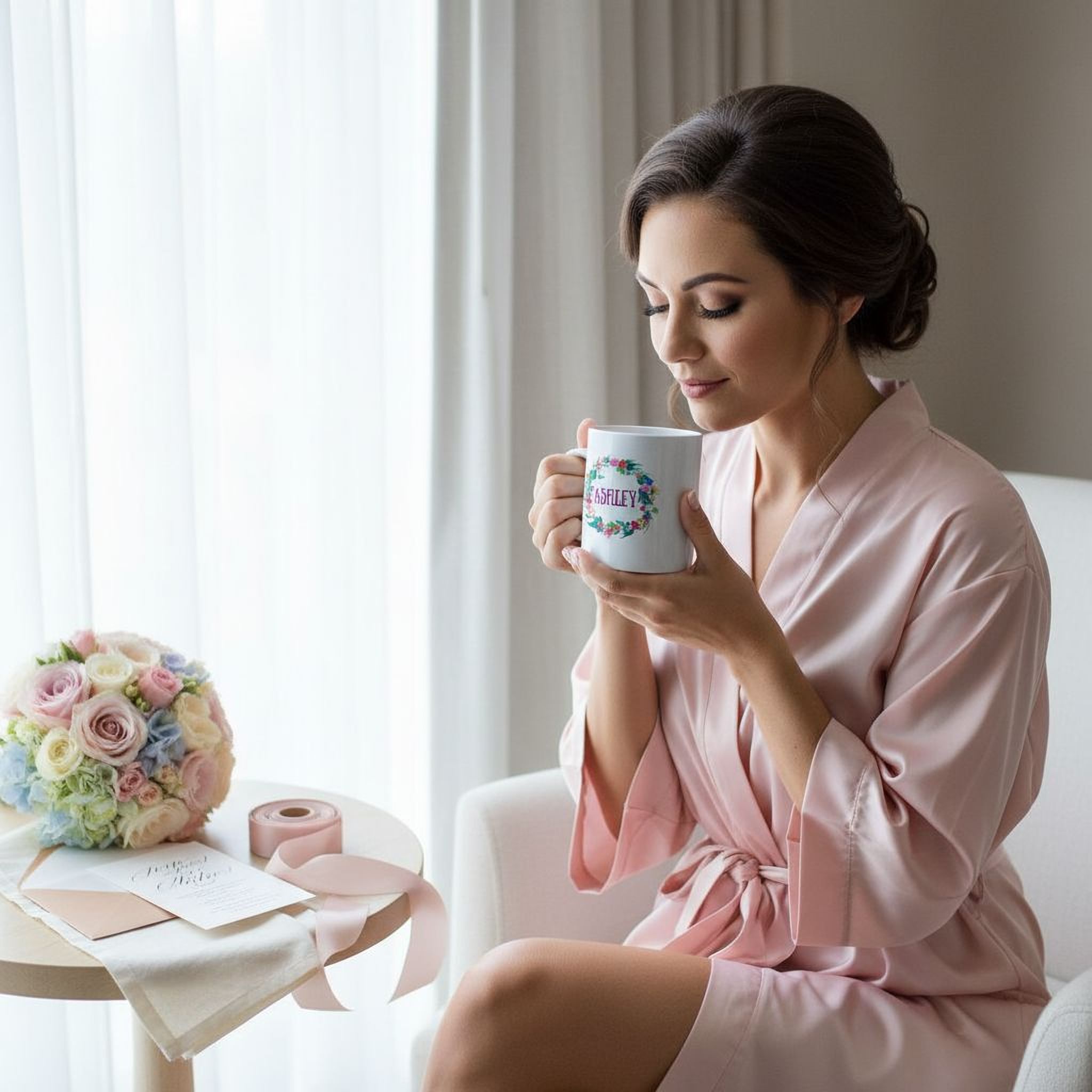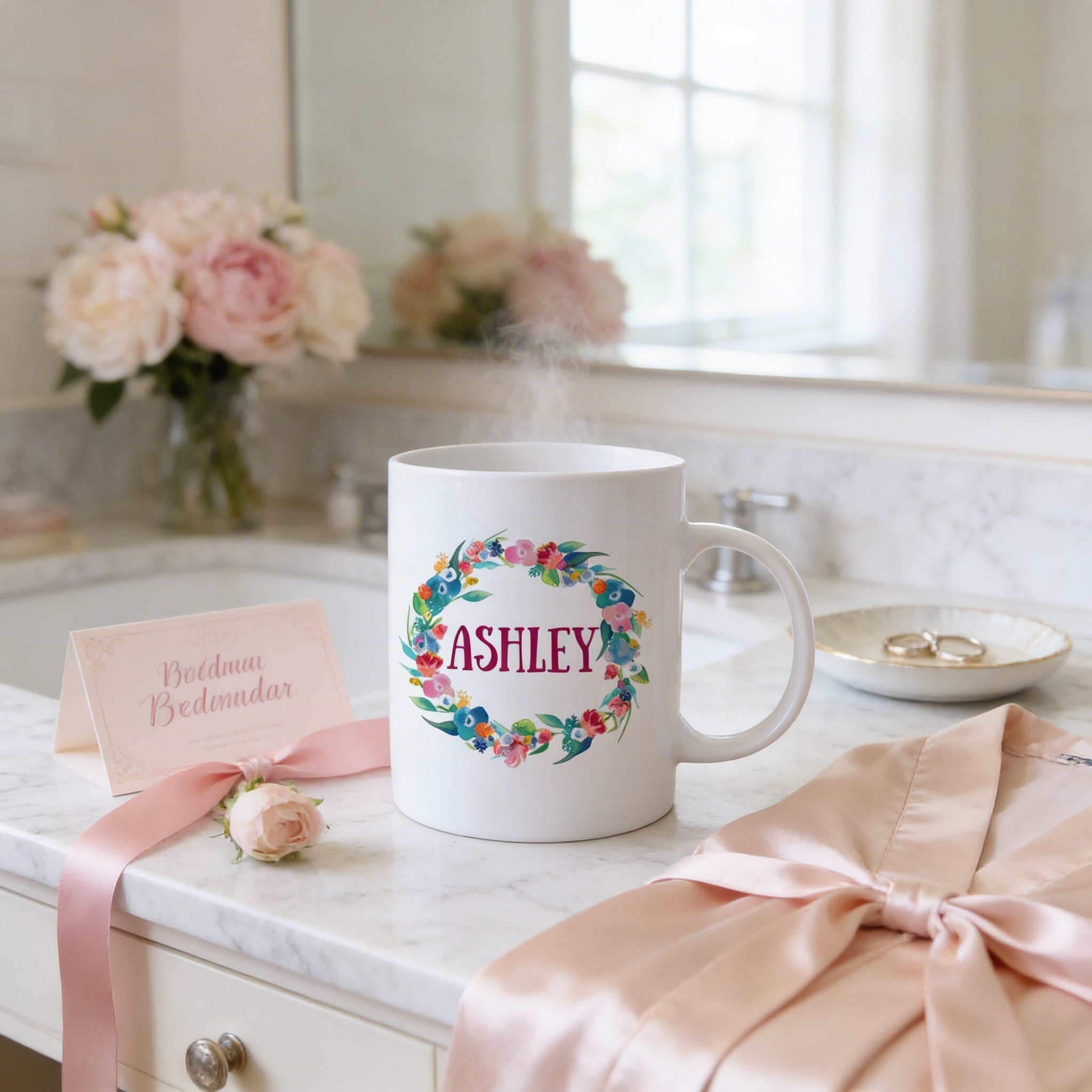 Each floral coffee cup is made from high-quality ceramic and comes in two sizes: 11 oz. and a large 15 oz. This dishwasher safe mug and microwave safe cup ensures convenience without sacrificing style or durability. The wreath design mug showcases a vibrant, hand-painted floral wreath printed on both sides, allowing your customized bridesmaid gift to be admired from any angle.