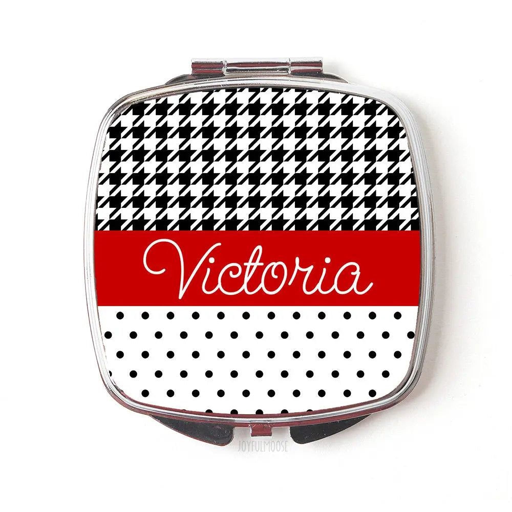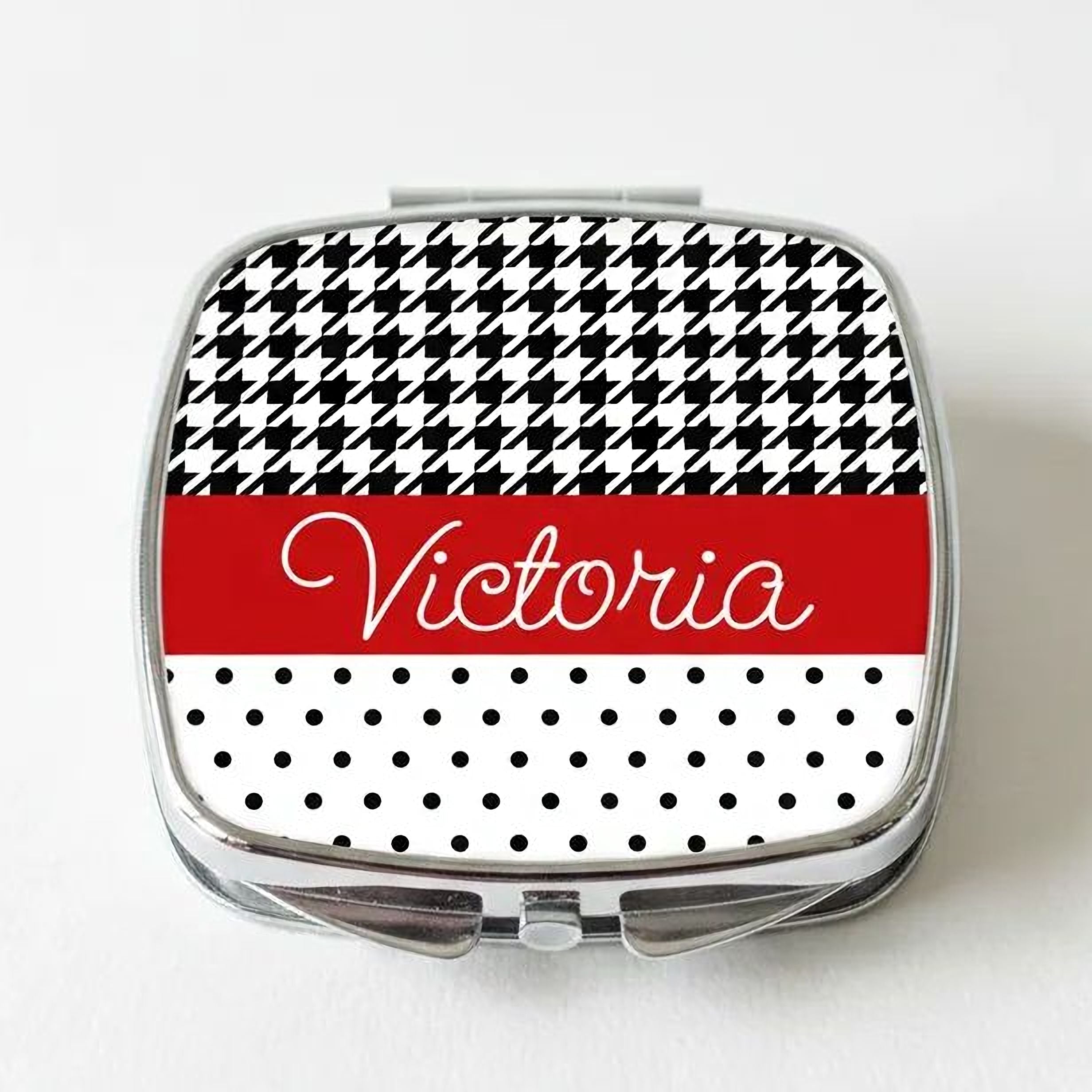 This personalized compact mirror is the perfect blend of style and function, designed to be a treasured personalized bridesmaid gift. Measuring 2.25" x 2.25", this silver compact mirror features a vibrant red black houndstooth and polka dot design, created using high-quality heat transfer printing for a permanent, fade-resistant finish. The compact mirror opens to reveal two clear mirrors, offering a portable makeup mirror solution that fits easily into any purse or clutch, making it an ideal handheld cosmetic mirror for quick touch-ups on the go.