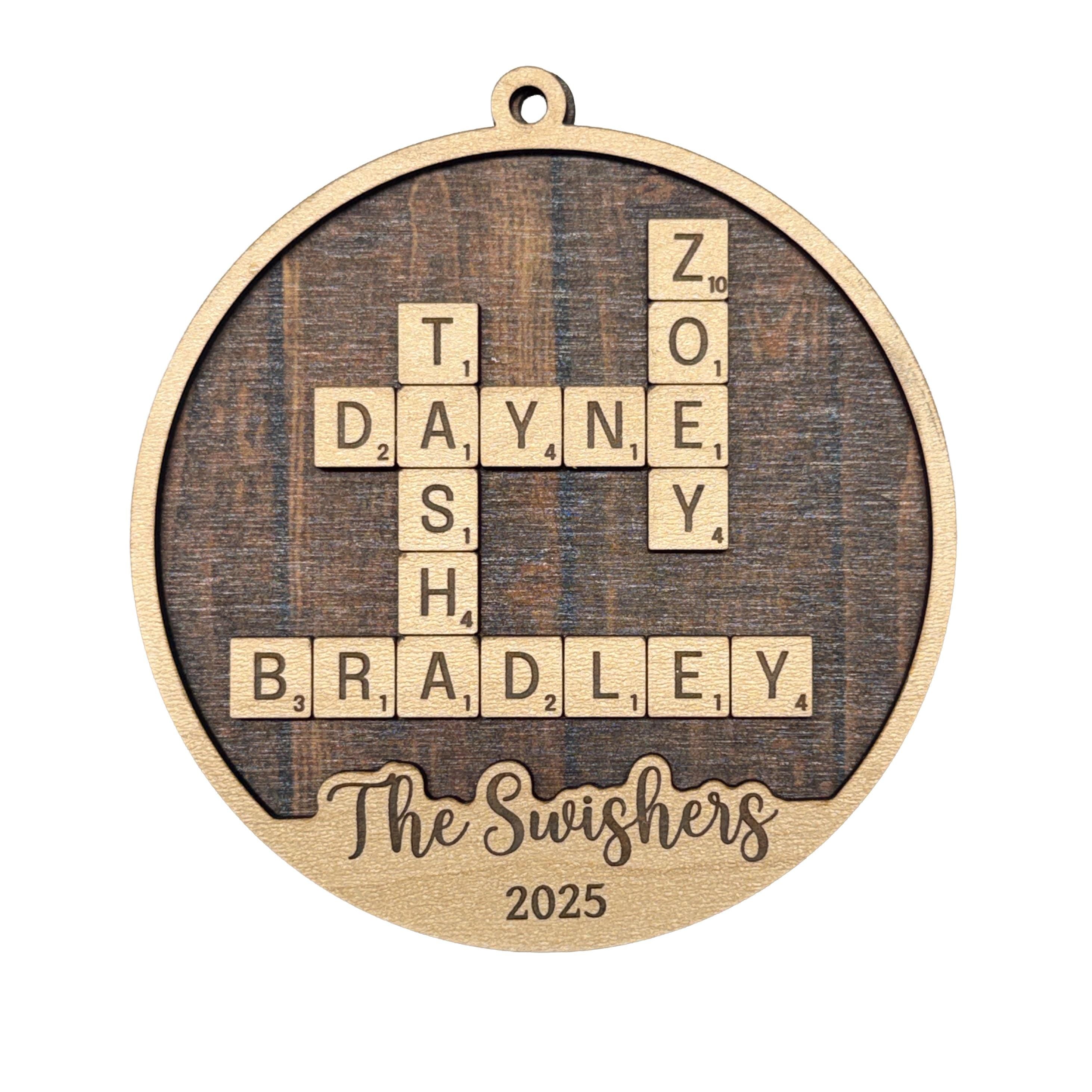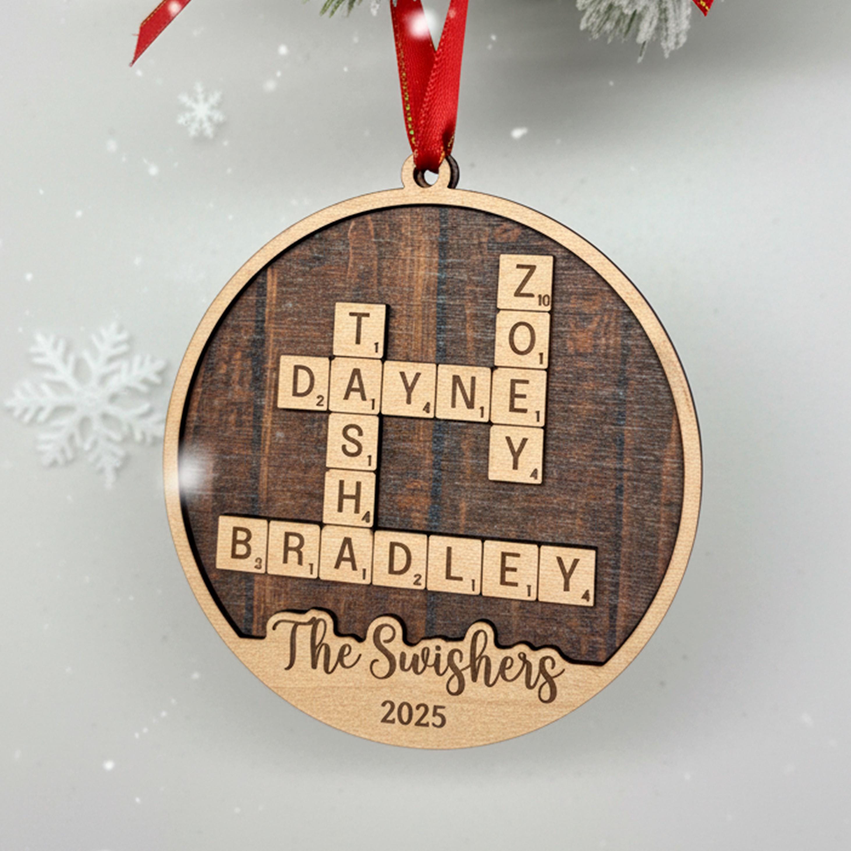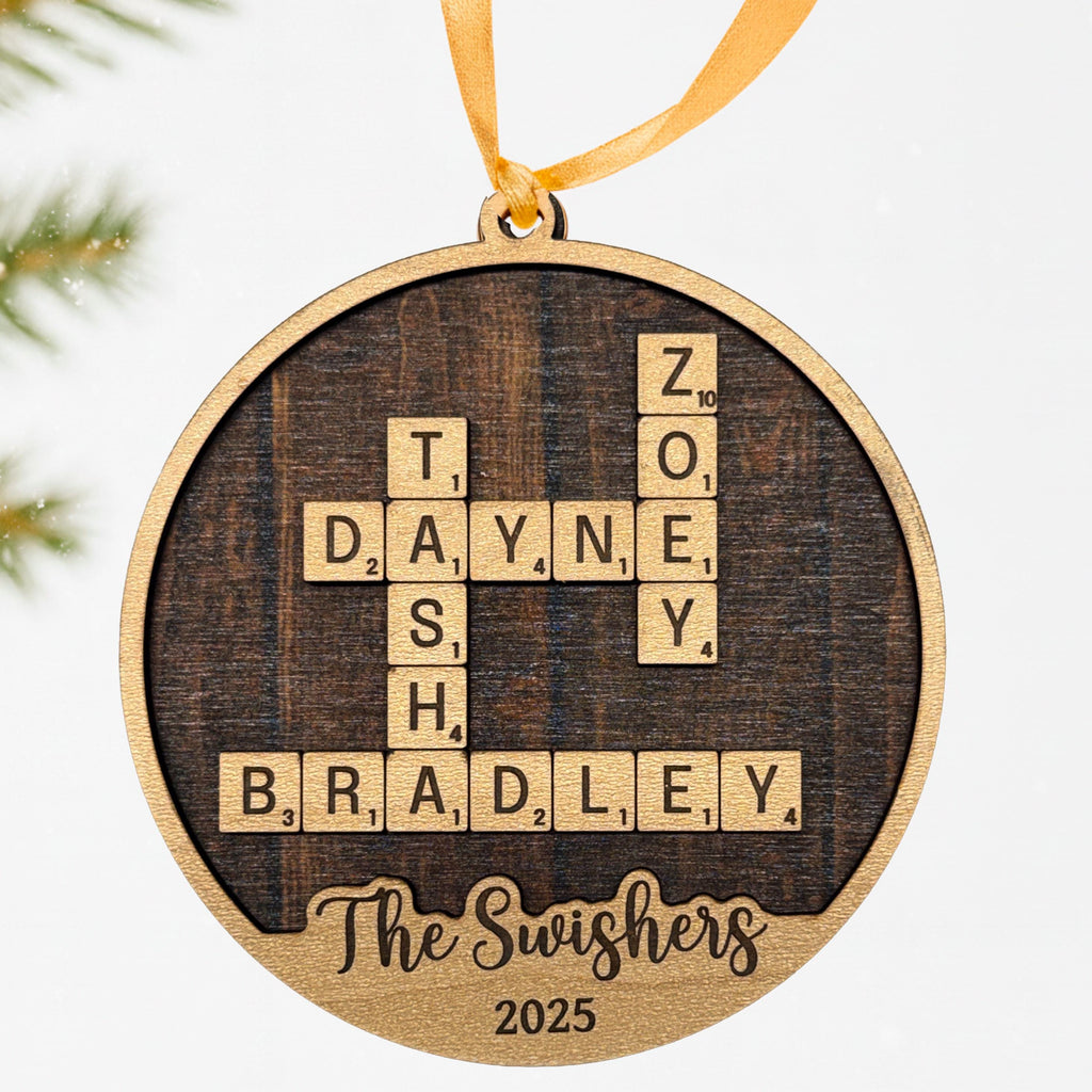 Each handmade holiday ornament is carefully laser cut to create a crossword style ornament showcasing your family names intertwined with precision. The custom laser cut ornament includes a heartfelt message or family name at the bottom, making it an ideal Christmas gift for family members or a memorable family reunion gift. The included twine loop makes it easy to hang as a holiday tree decoration that will be treasured for years.