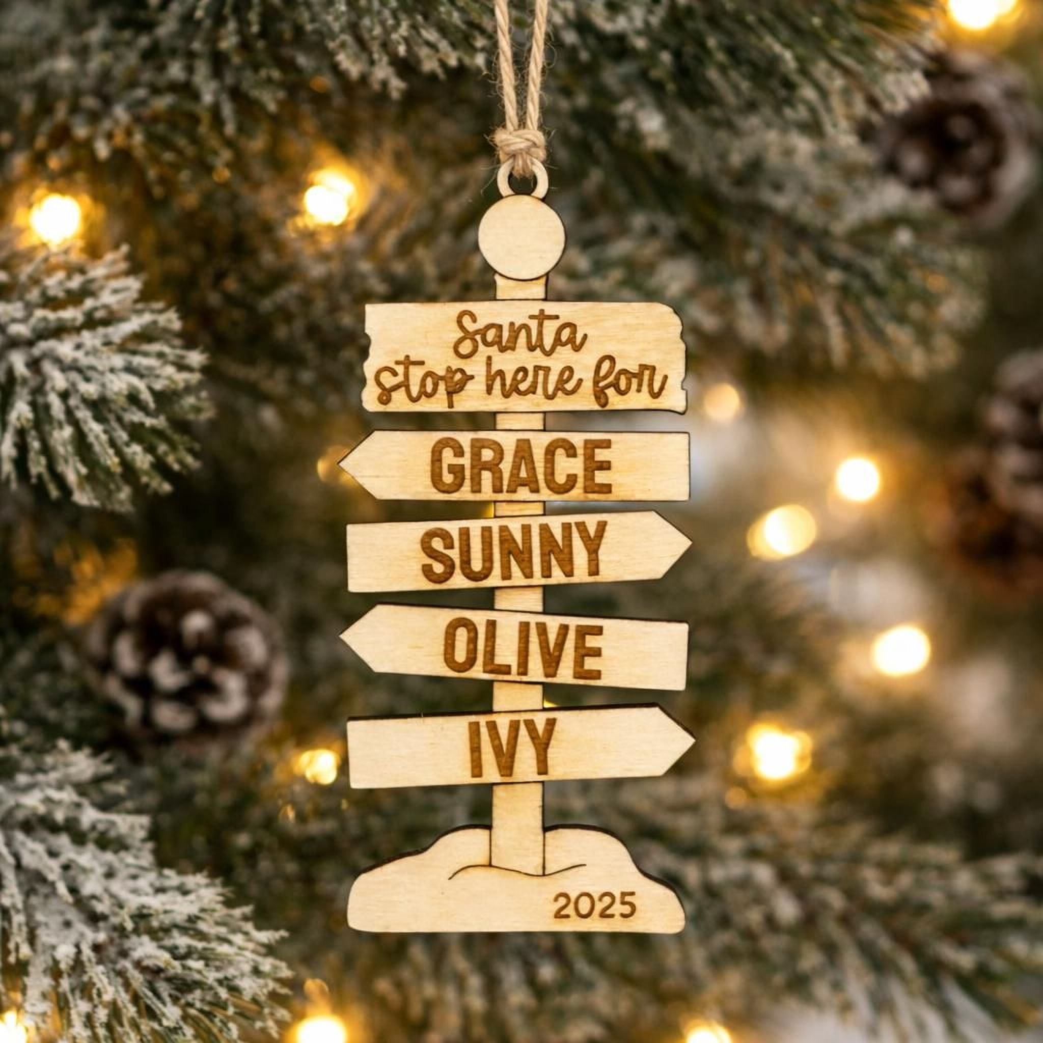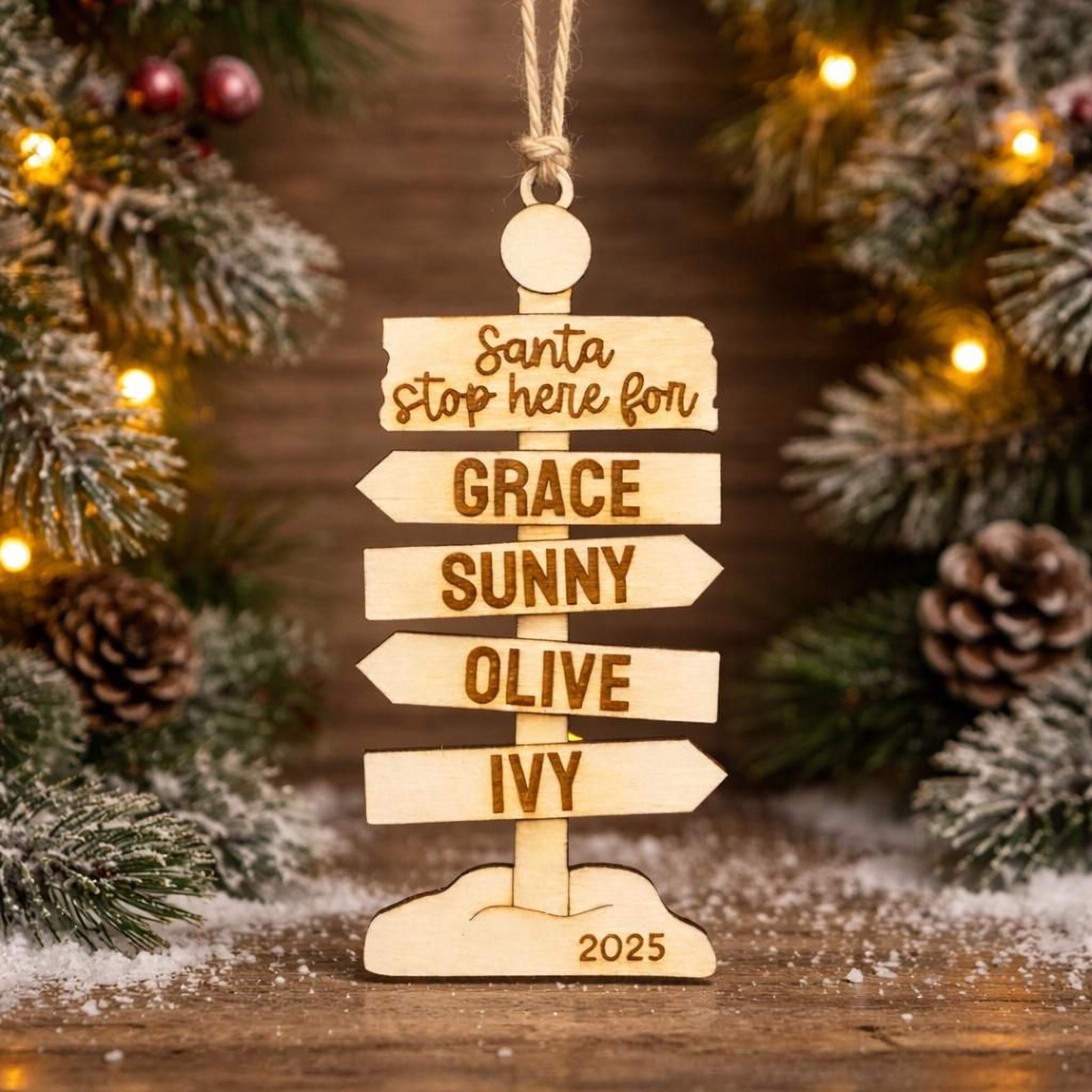 This personalized family ornament is a beautifully crafted wooden Christmas ornament designed to add a warm, rustic touch to your holiday tree while creating a lasting family keepsake. Featuring the charming “Santa Stop Here For” signpost design, this custom engraved ornament showcases your family’s names with precision laser-cut wood lettering, delivering a unique farmhouse Christmas decor piece that brings joy year after year.