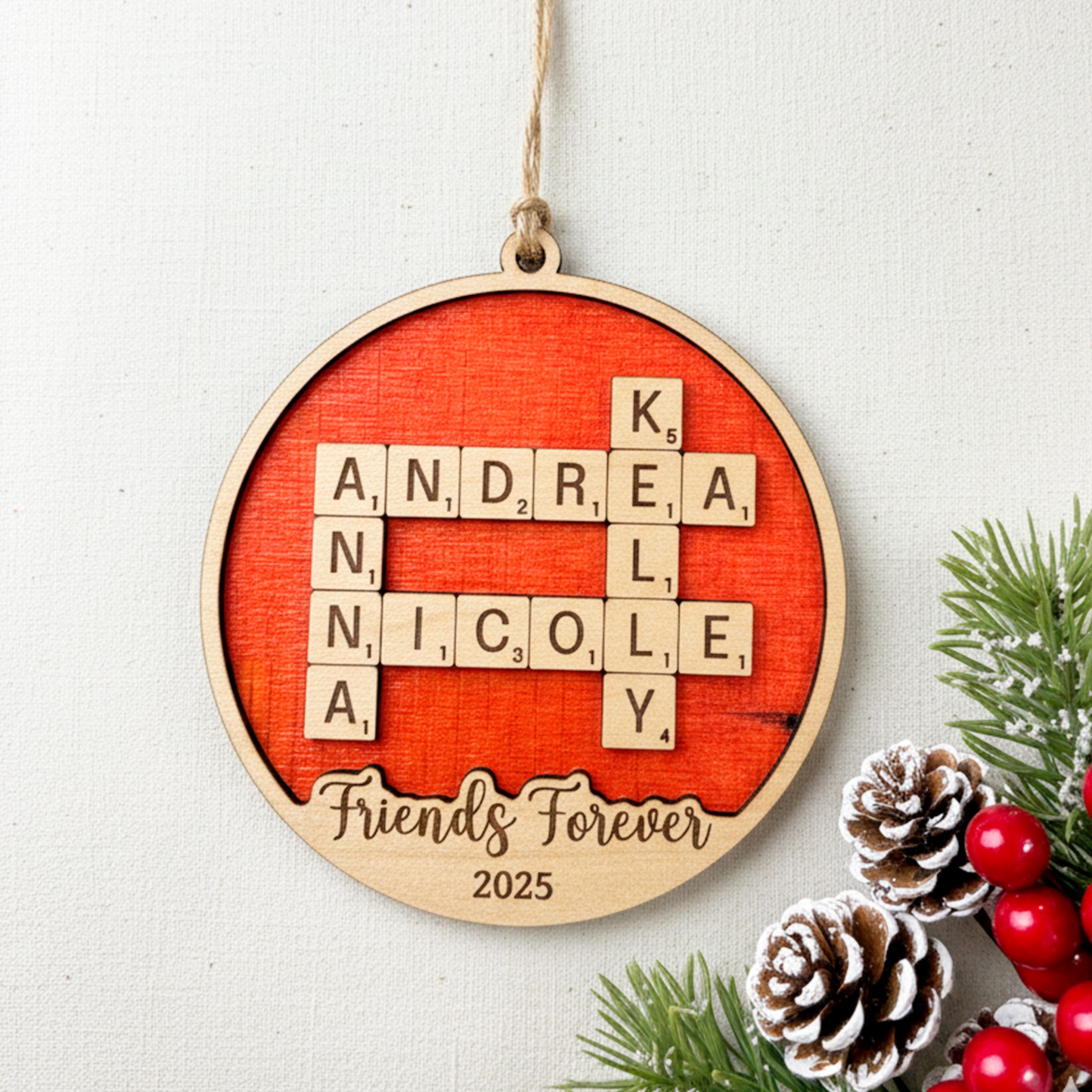 Our personalized wooden ornament, the Friends Forever Crosswords Wooden Christmas Ornament, is a unique friendship gift designed to celebrate the special bond between best friends or family members. This laser engraved ornament features a crossword puzzle design with engraved name ornament details, making it a meaningful friendship keepsake and a perfect holiday gift for friends. Crafted from two layers of premium wood with a natural wood finish, this wooden Christmas ornament serves as both a beautiful Christmas tree decoration and a custom besties gift that stands out on your tree.
