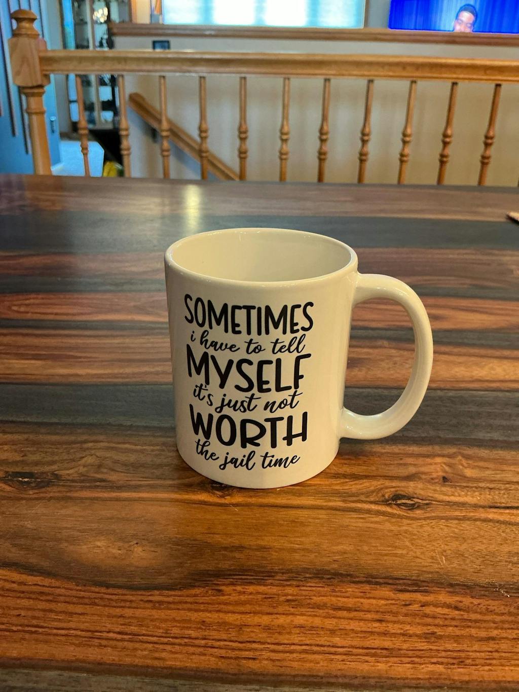 Funny Saying Coffee Mug says "Sometimes I have to tell myself it's just not worth the jail time". Makes great gift for the hard to buy for people in your life.