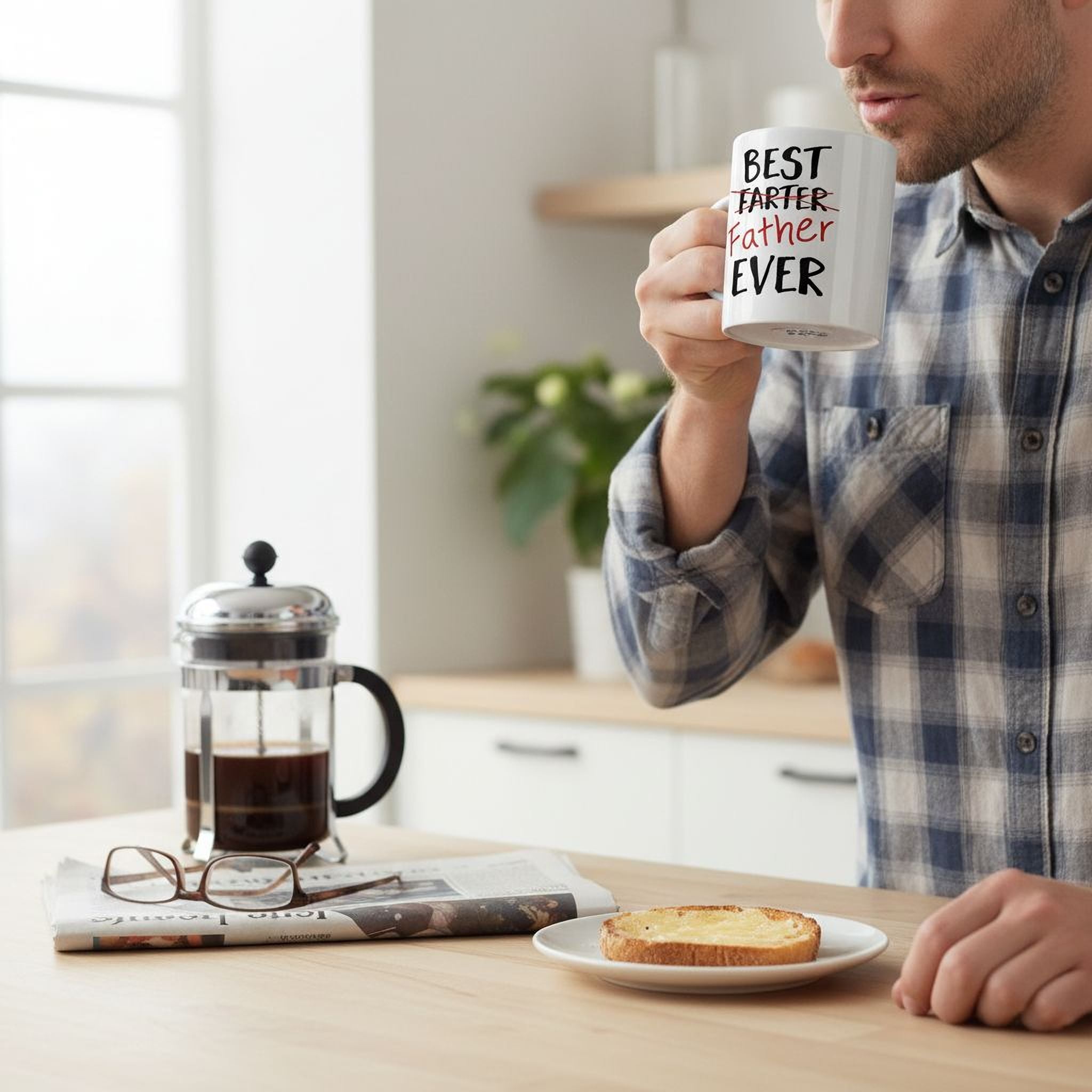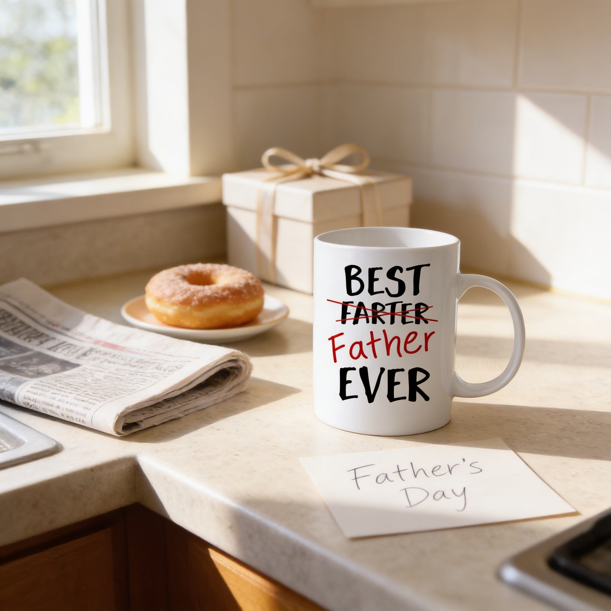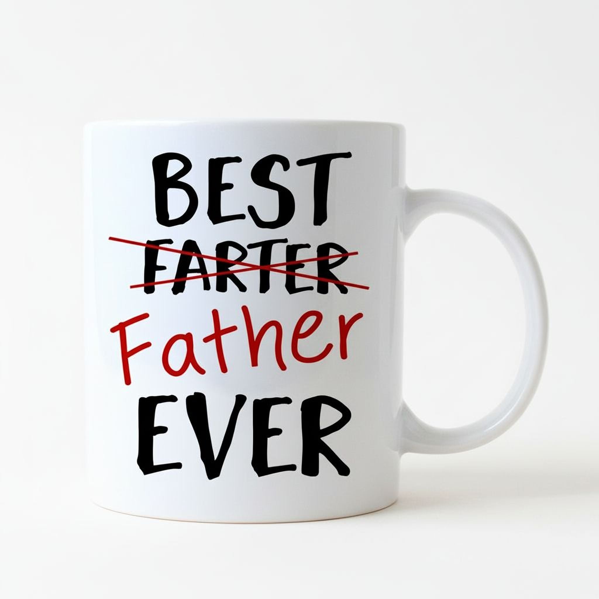 This coffee mug for dad is the perfect blend of humor and heartfelt sentiment, designed to celebrate fathers with a smile. Featuring the playful phrase "Best Farter Ever" cleverly crossed out and replaced with "Best Father Ever," this mug delivers a unique gift for dad that combines laughter with love. Crafted from high-quality ceramic, this dad coffee mug is available in two sizes—11 oz. and a large 15 oz.—to suit every coffee lover's preference. The dishwasher safe mug ensures easy cleaning, while microwave safety adds convenience for busy mornings. Each joyful moose mugs design is custom printed on both sides, making it a standout fathers day gift that shows thoughtfulness and fun.