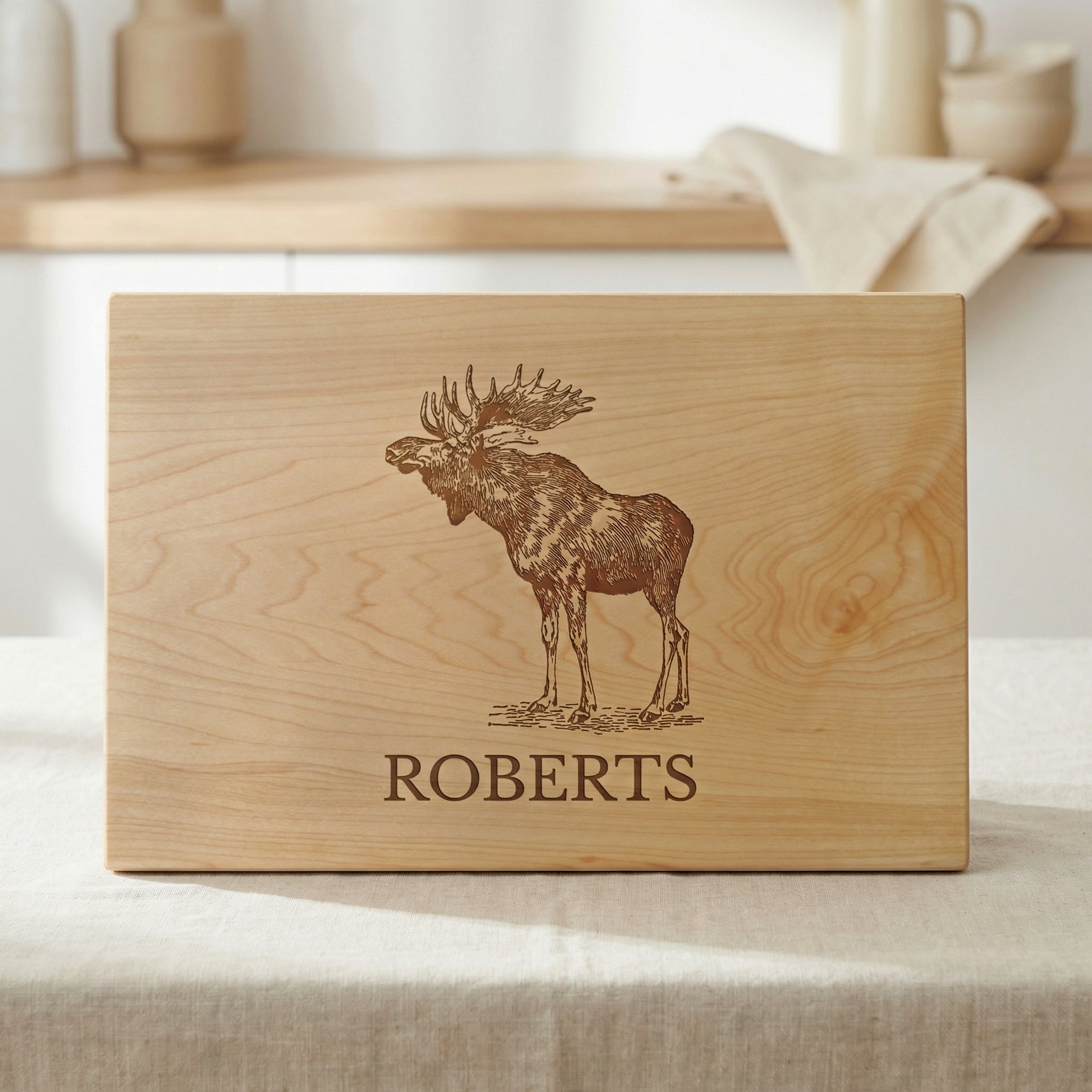 The Moose Cutting Board is a beautifully crafted kitchen chopping board designed to bring both function and charm to your home. This moose cutting board features a laser engraved design of a majestic moose, personalized with your family last name, making it an ideal custom family gift that will be treasured for years to come. Available in Hard Maple or Black Walnut, this engraved wood board combines heirloom quality with practical use, perfect for daily meal prep or serving.