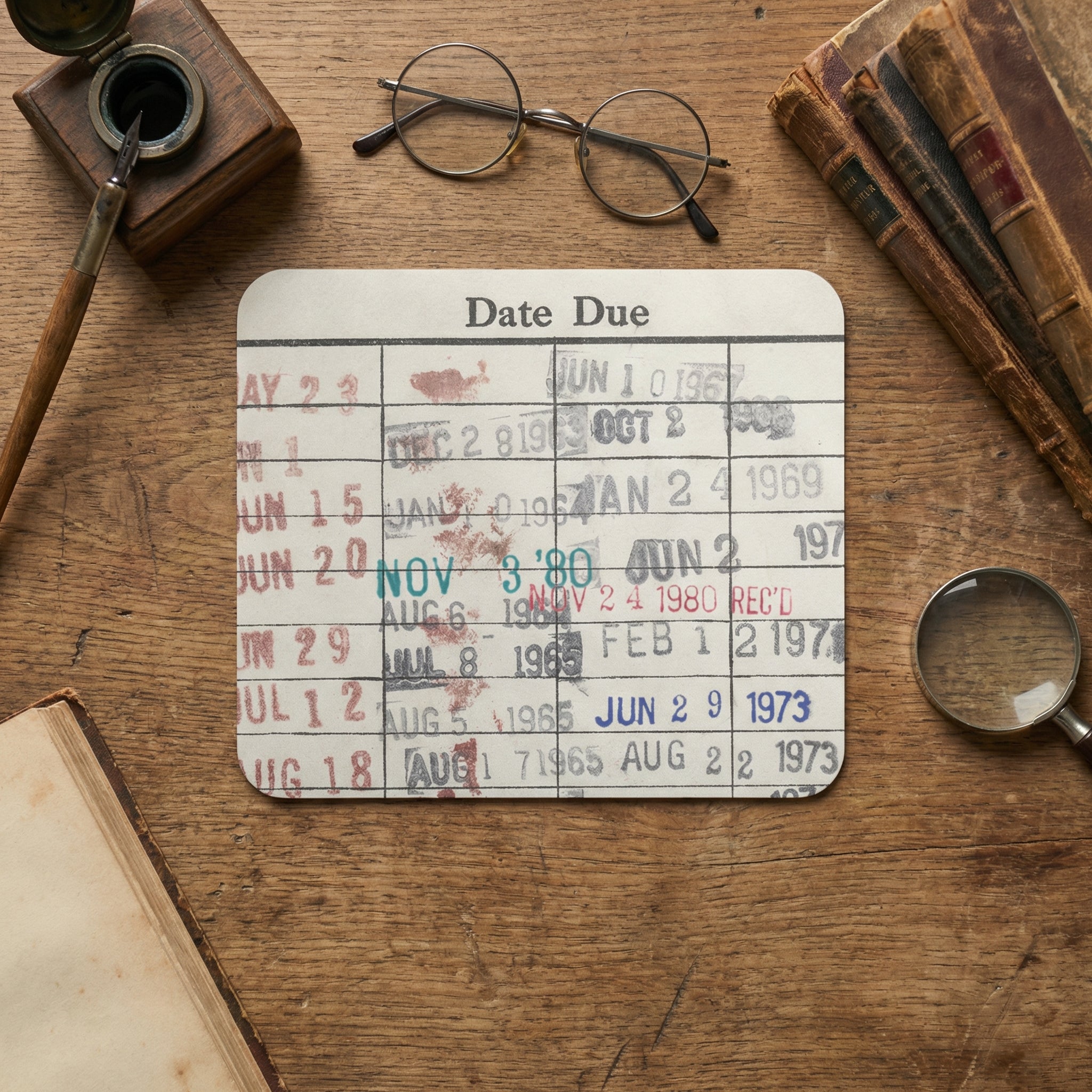 - Design: Retro library checkout card graphic with due dates for authentic vintage feel