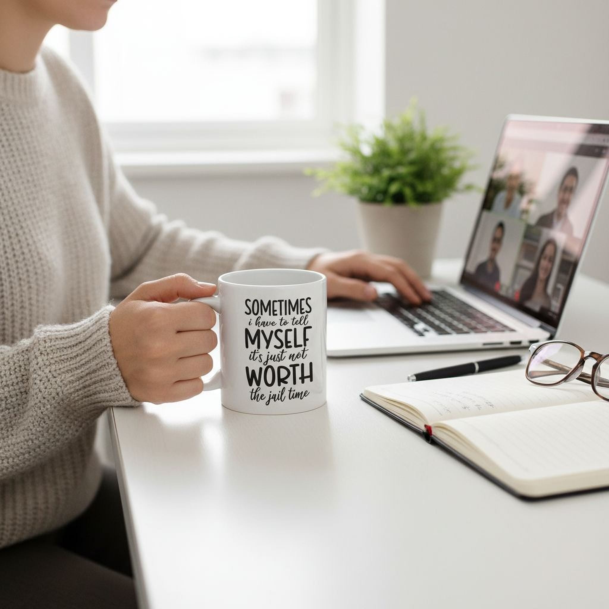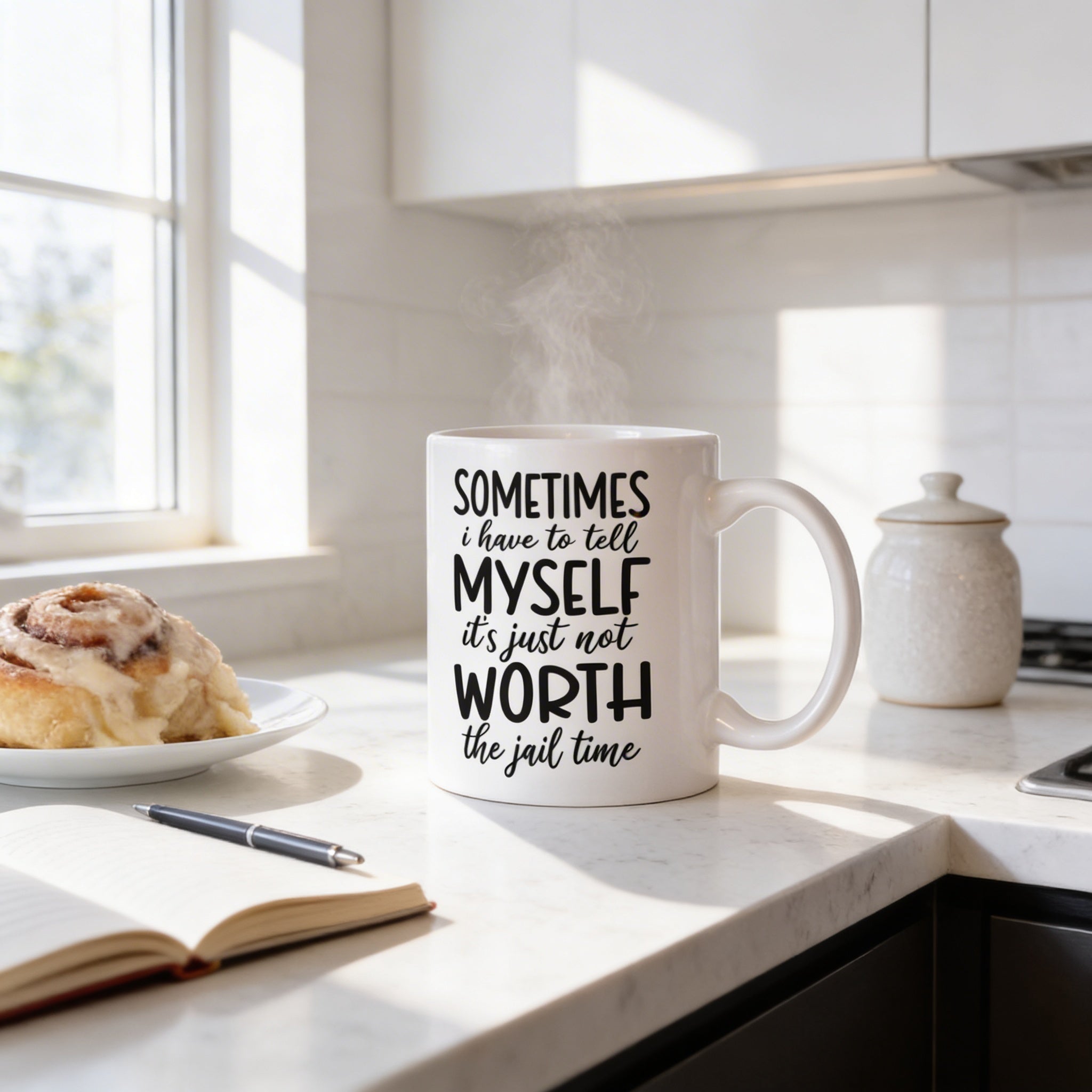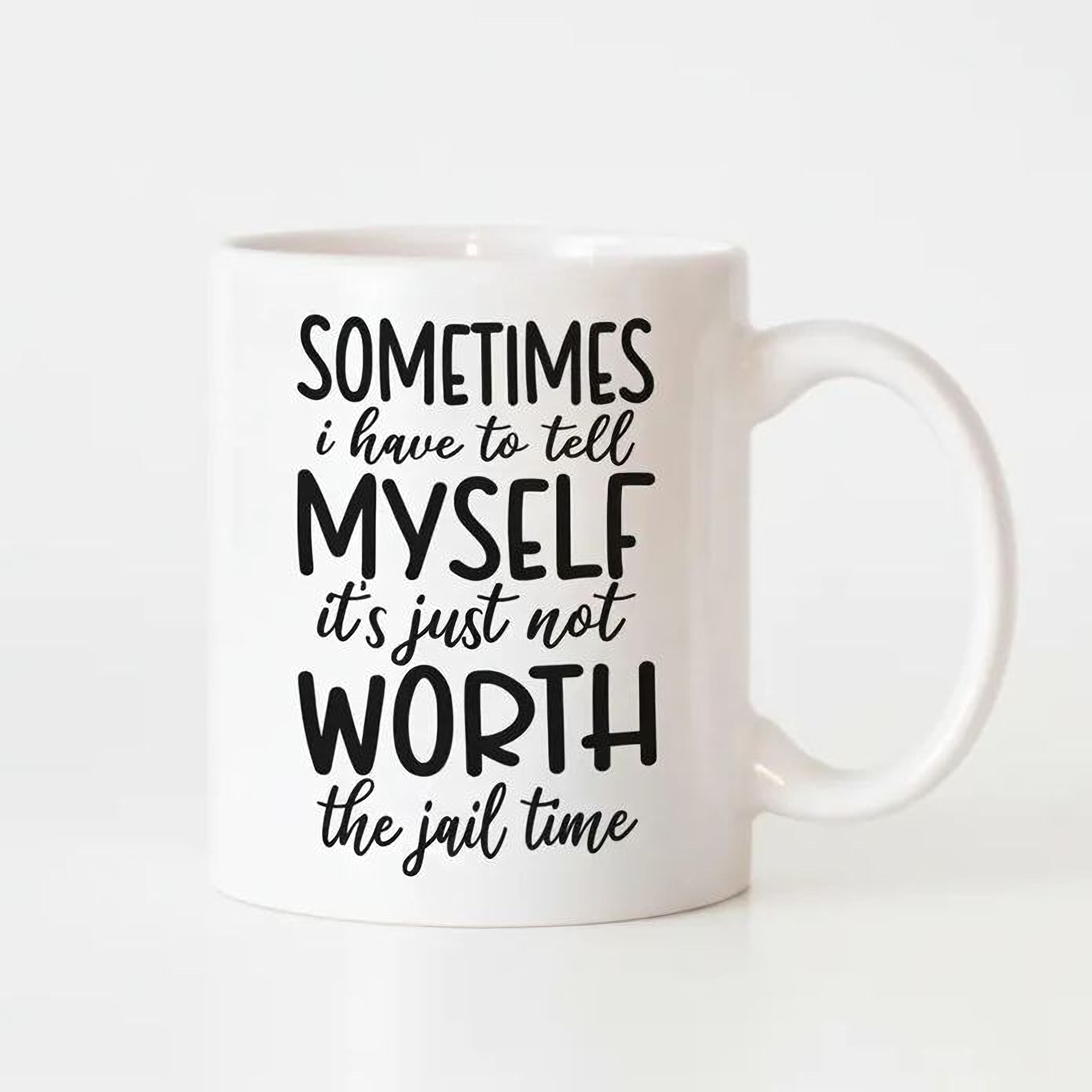 Our funny coffee mugs from Joyful Moose are perfect for anyone who loves a good laugh with their morning brew. These ceramic coffee mugs feature the hilarious saying "Sometimes I have to tell myself it's just not worth the jail time," making them ideal for brightening up your day or gifting as a funny stocking stuffer or holiday gift mug. Designed to deliver both humor and practicality, these mugs help you enjoy your coffee while sharing a smile with friends, family, or coworkers.