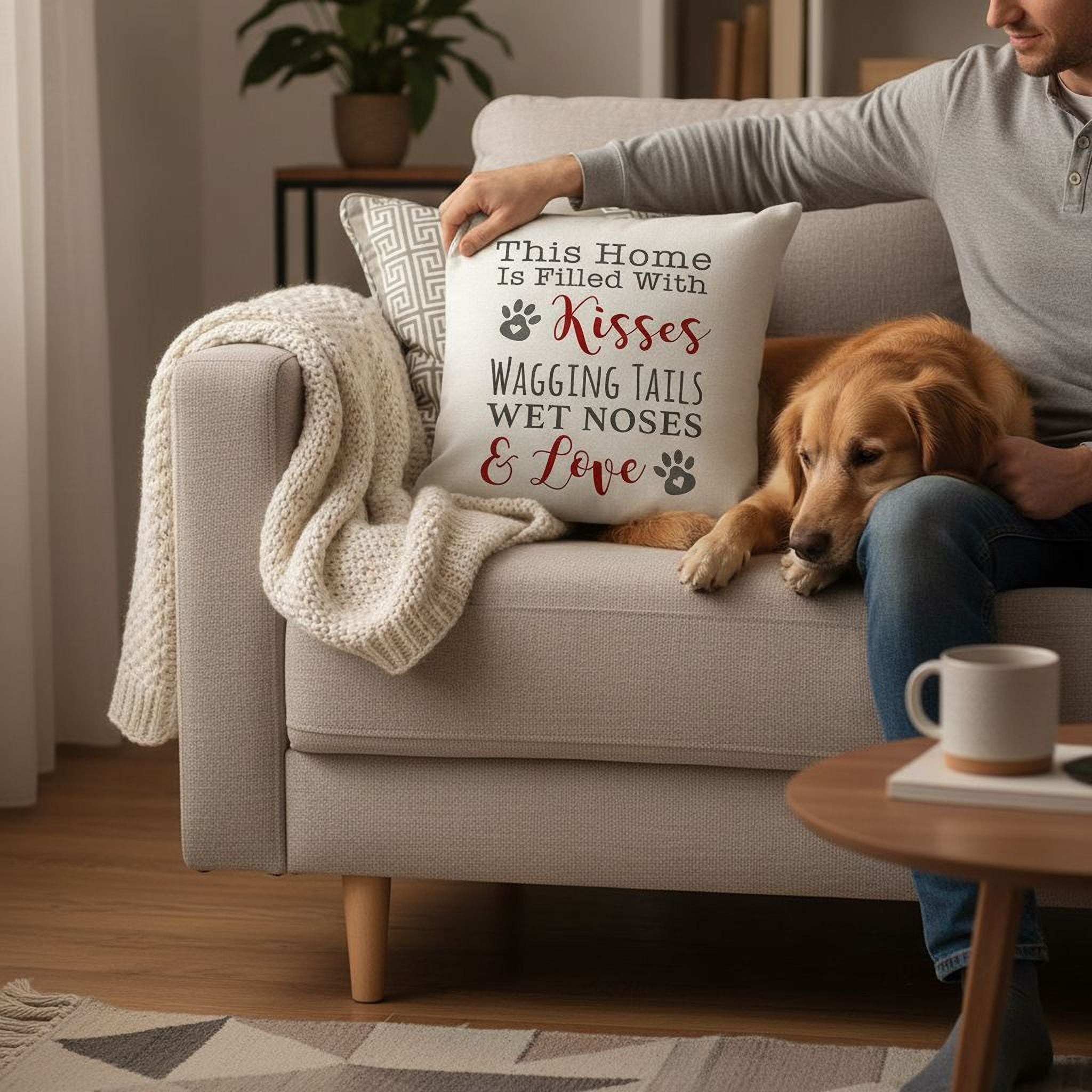 Dog Quote Pillow Cover ads a touch of charm to the dog lovers decor. "This Home is Filled with Kisses Wagging Tails Wet Noses & Love" along with pawprints in trendy gray & red design.