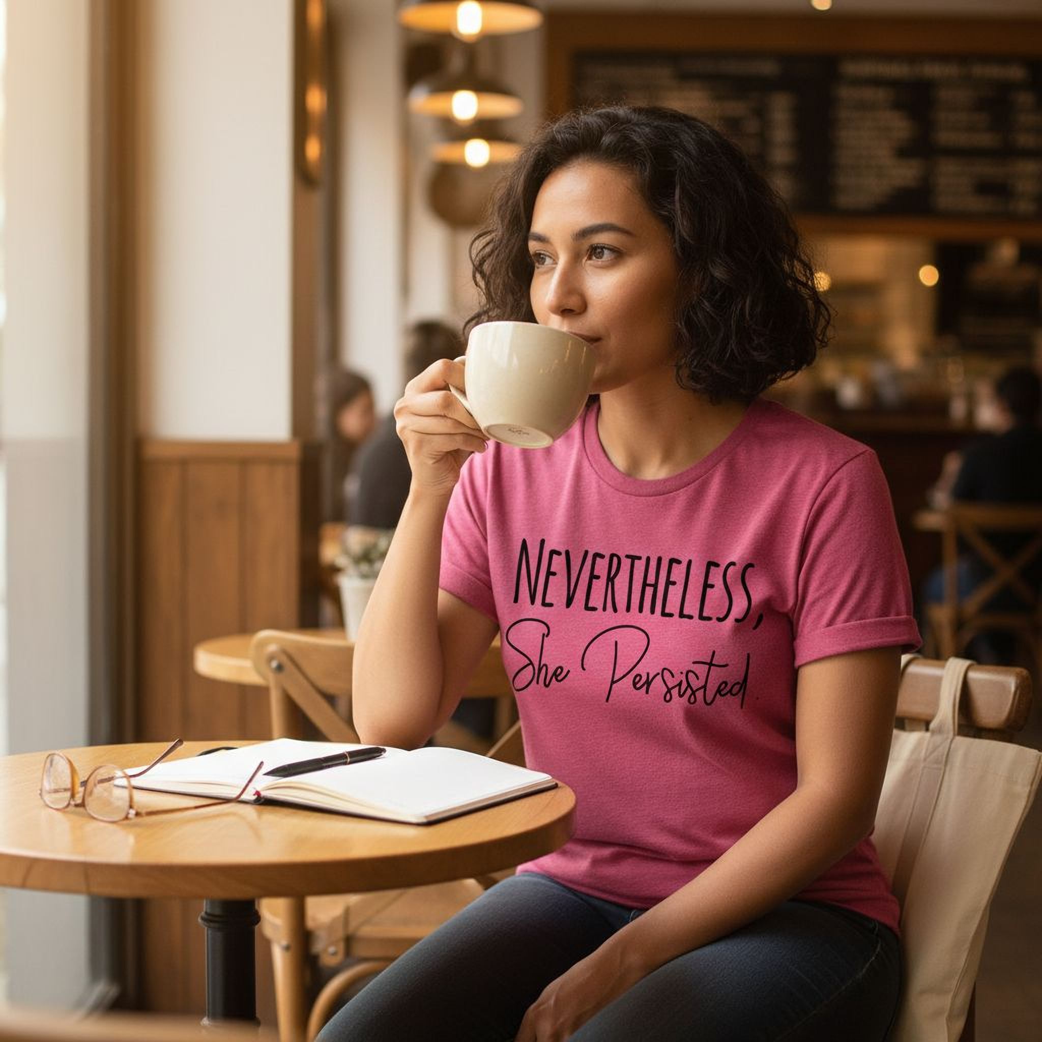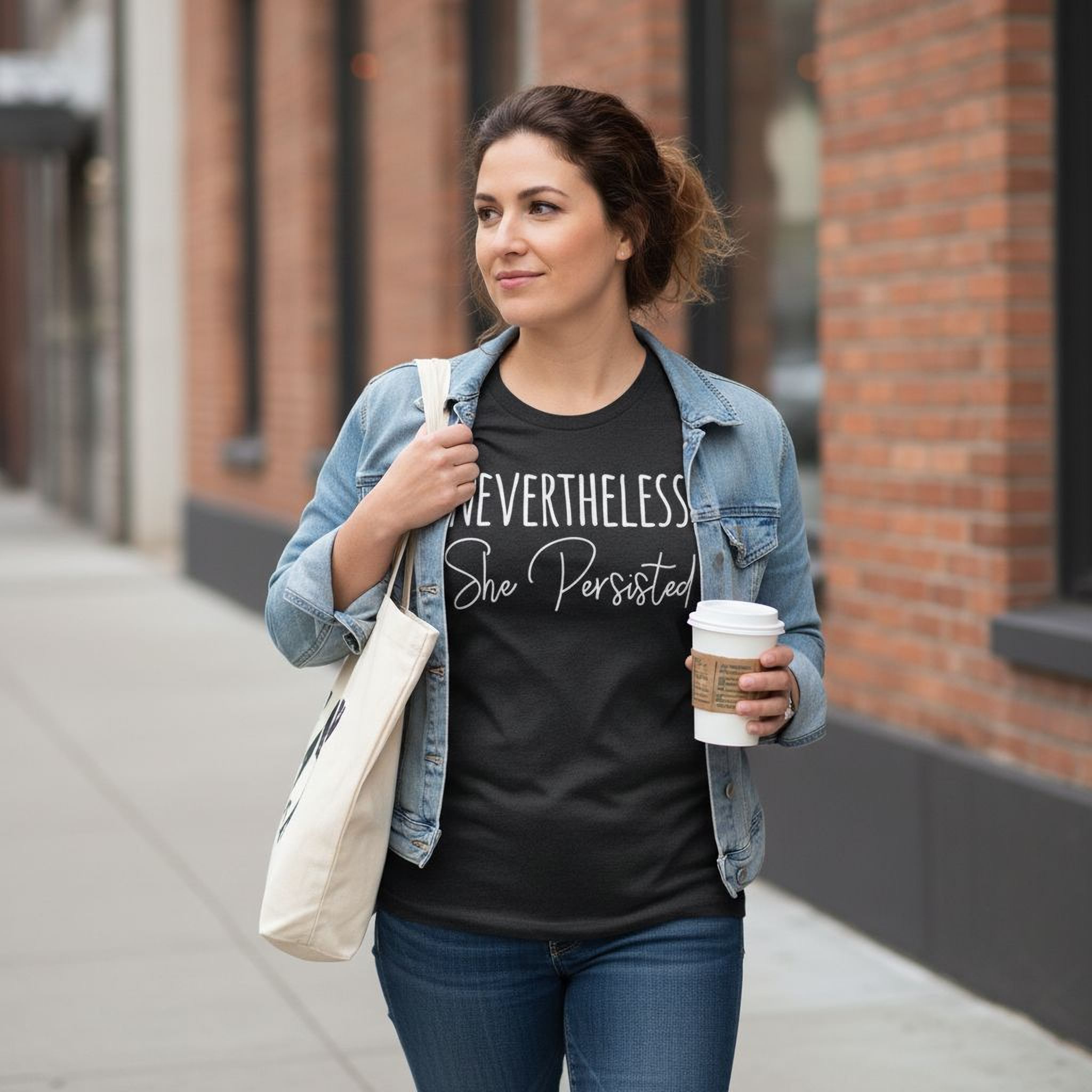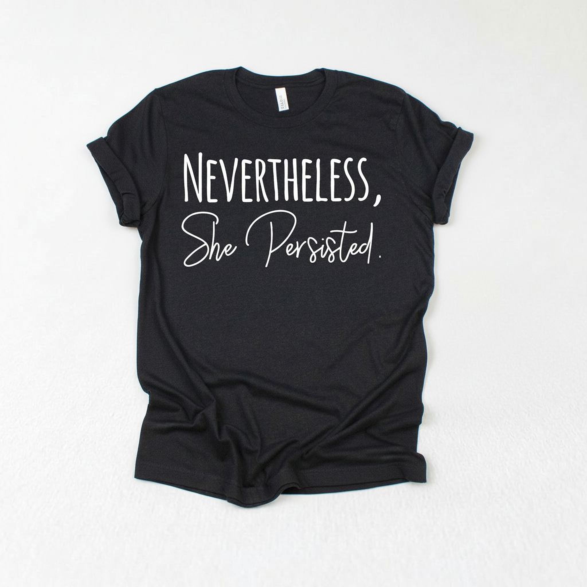 The Nevertheless She Persisted Shirt is a women's graphic tee designed to inspire and empower while providing unmatched comfort. This motivational t-shirt features a trendy black design with the powerful phrase "Nevertheless, She Persisted," making it perfect as a casual workout shirt or everyday wear. Crafted from premium Bella Canvas fabric, this cotton casual shirt delivers a soft cotton blouse feel that keeps you comfortable all day. The eco-friendly printed shirt uses advanced DTG printing technology, ensuring vibrant colors and durability without heat transfer vinyl or screen printing.