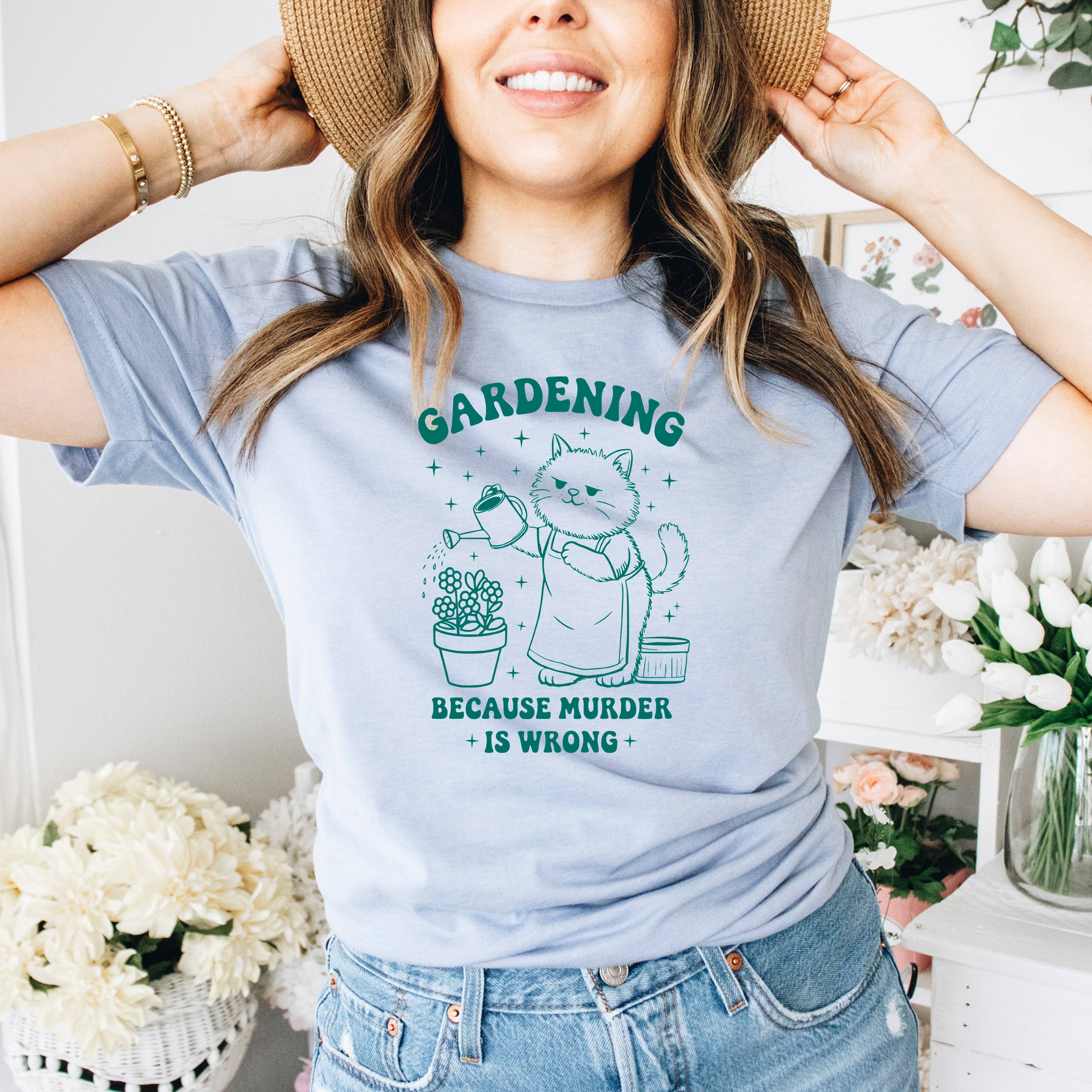 Design:** "Gardening Because Murder Is Wrong" featuring a cat illustration in vintage green.