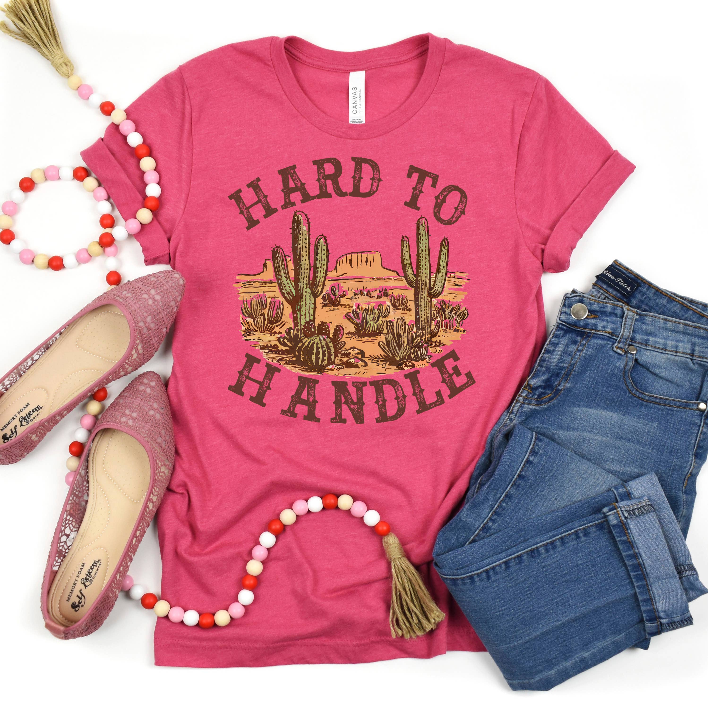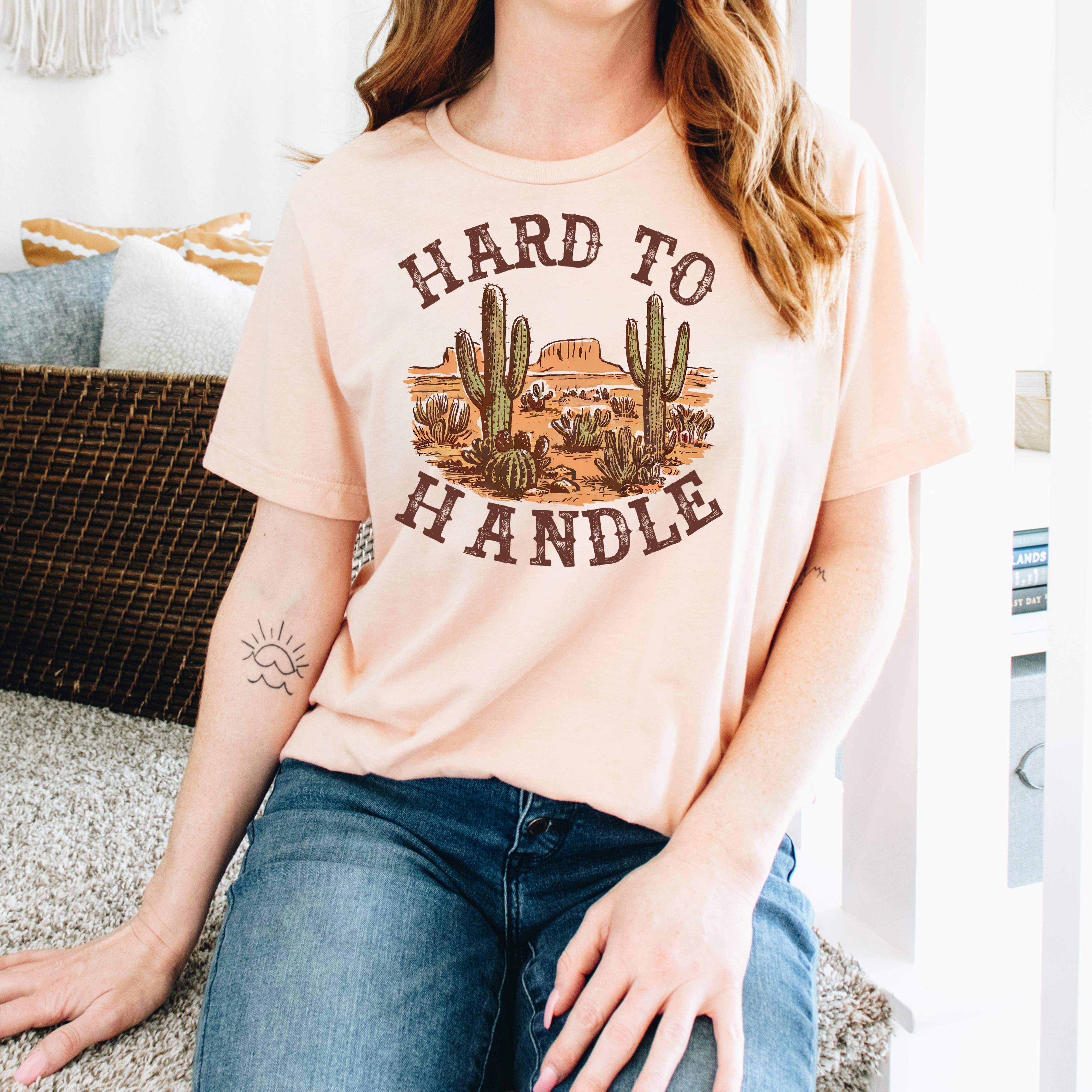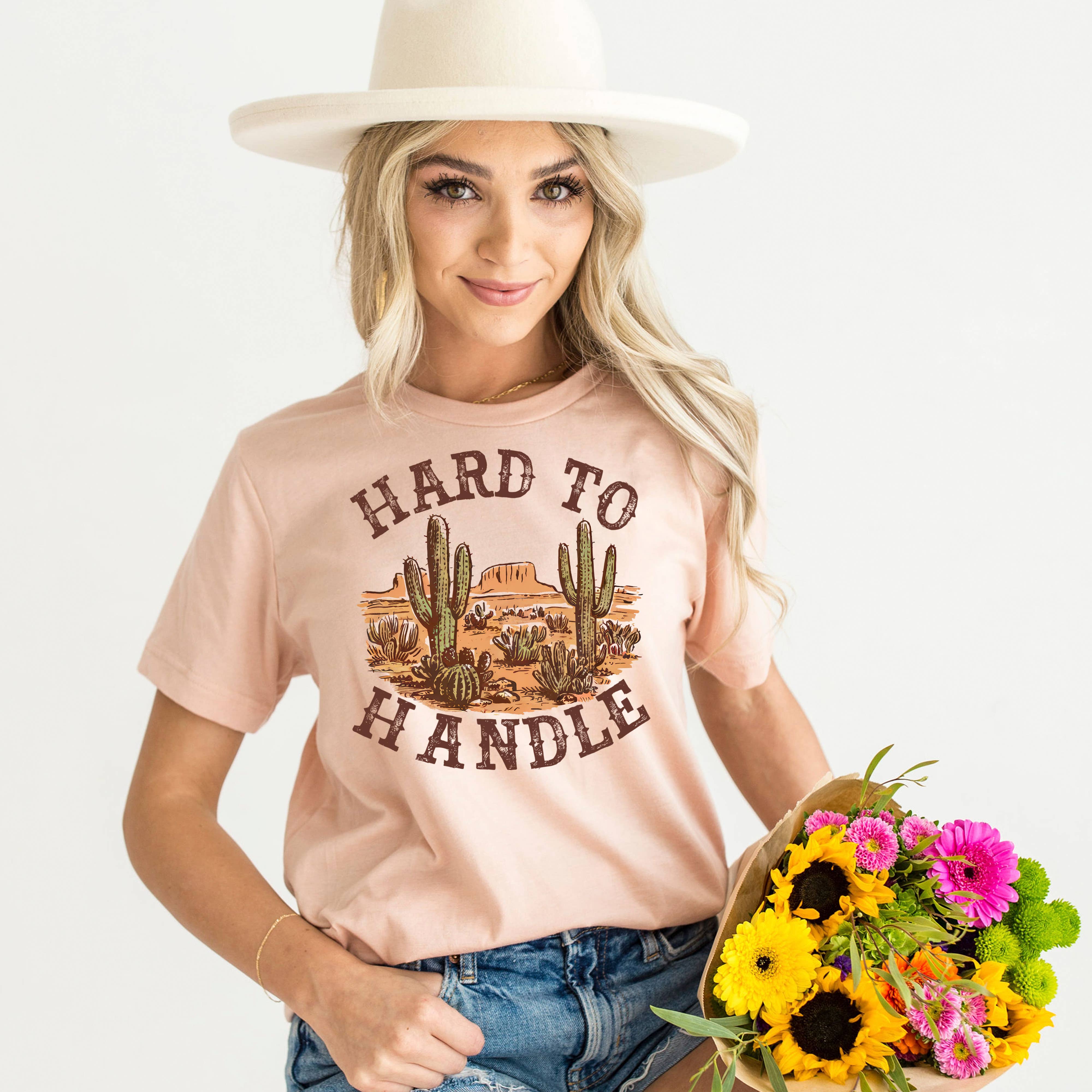 Elevate your boutique's western apparel collection with graphic tees western that capture the spirited essence of desert dreamers—this "Hard to Handle" design showcases a vintage-distressed saguaro cactus landscape with rustic typography that resonates with customers seeking authentic cowgirl attitude.
