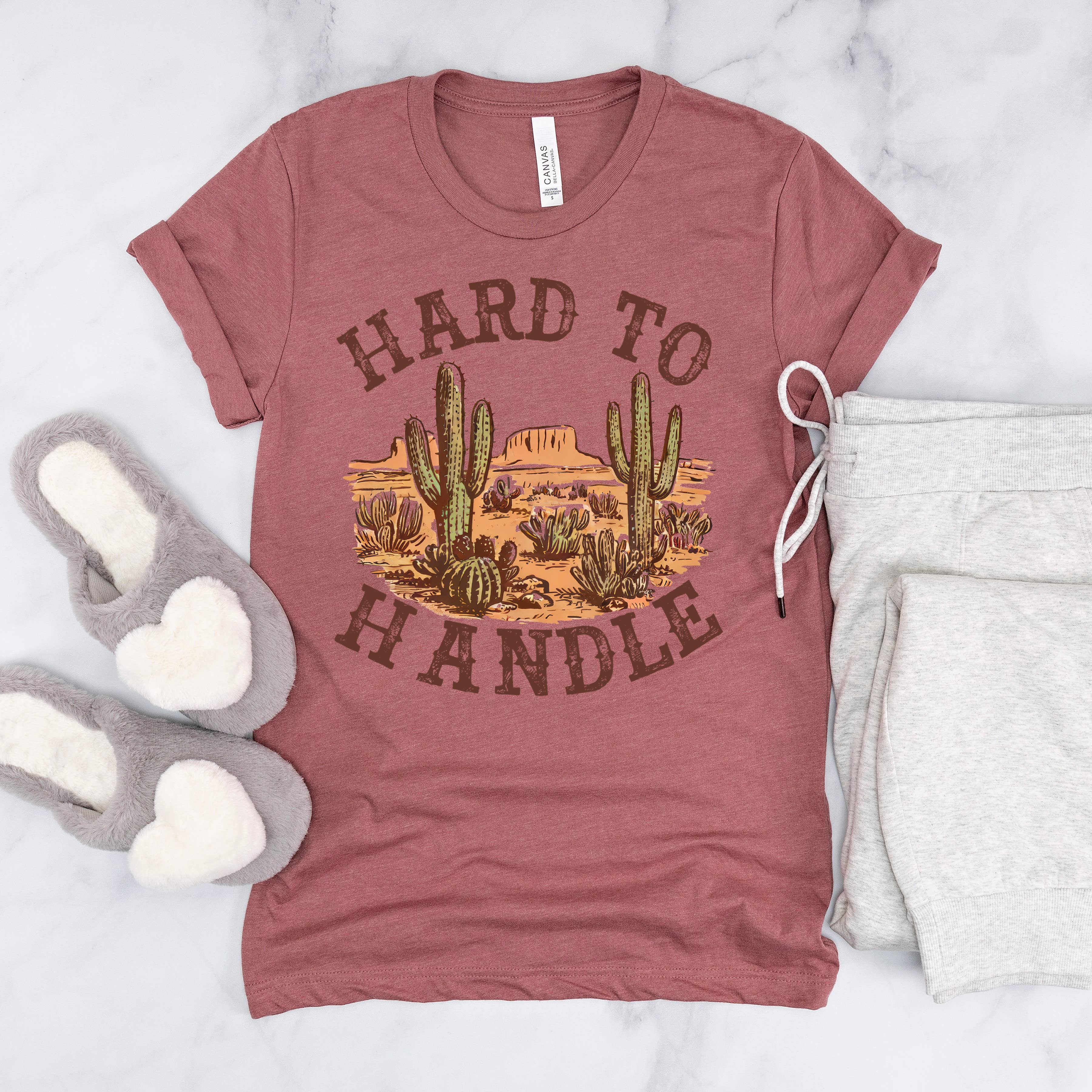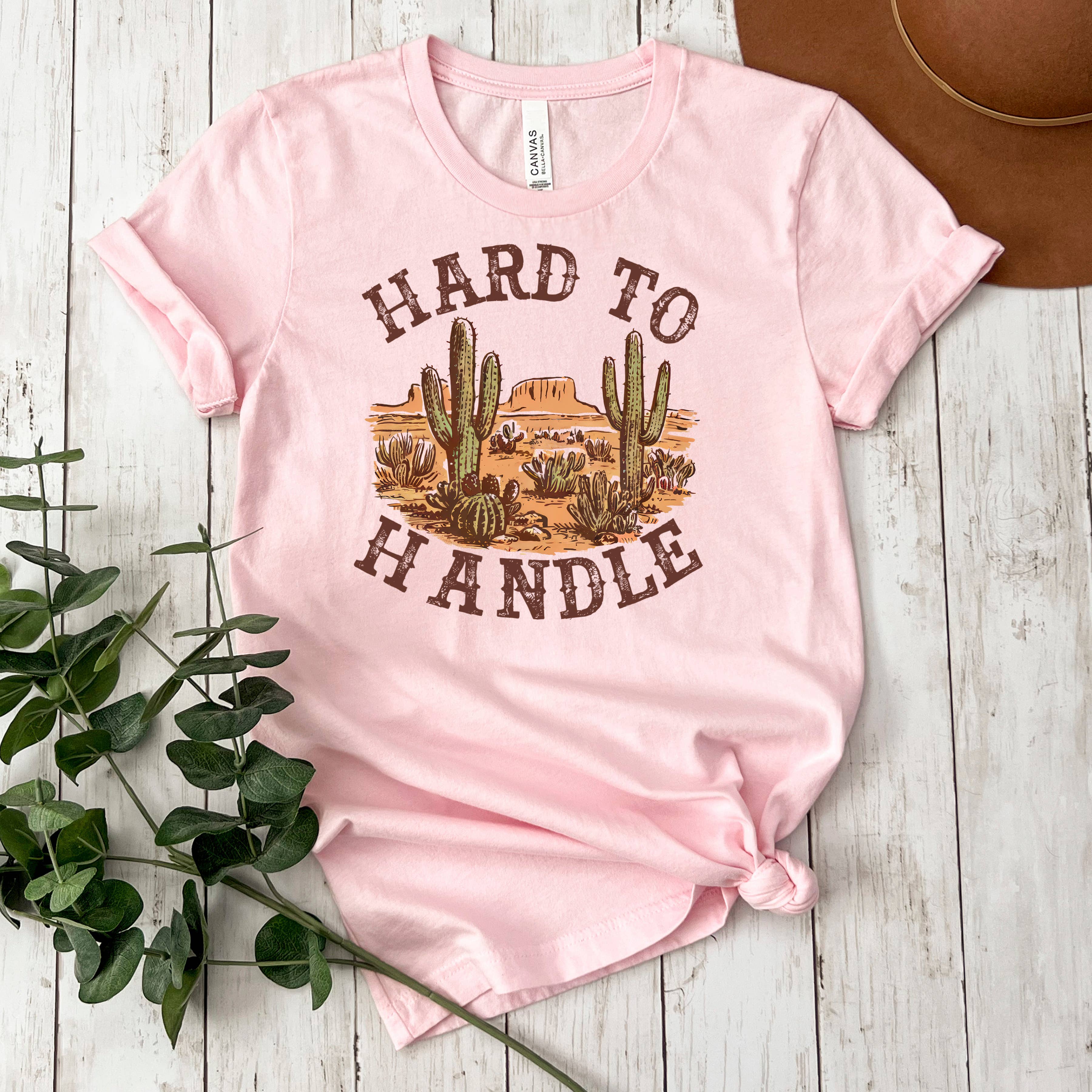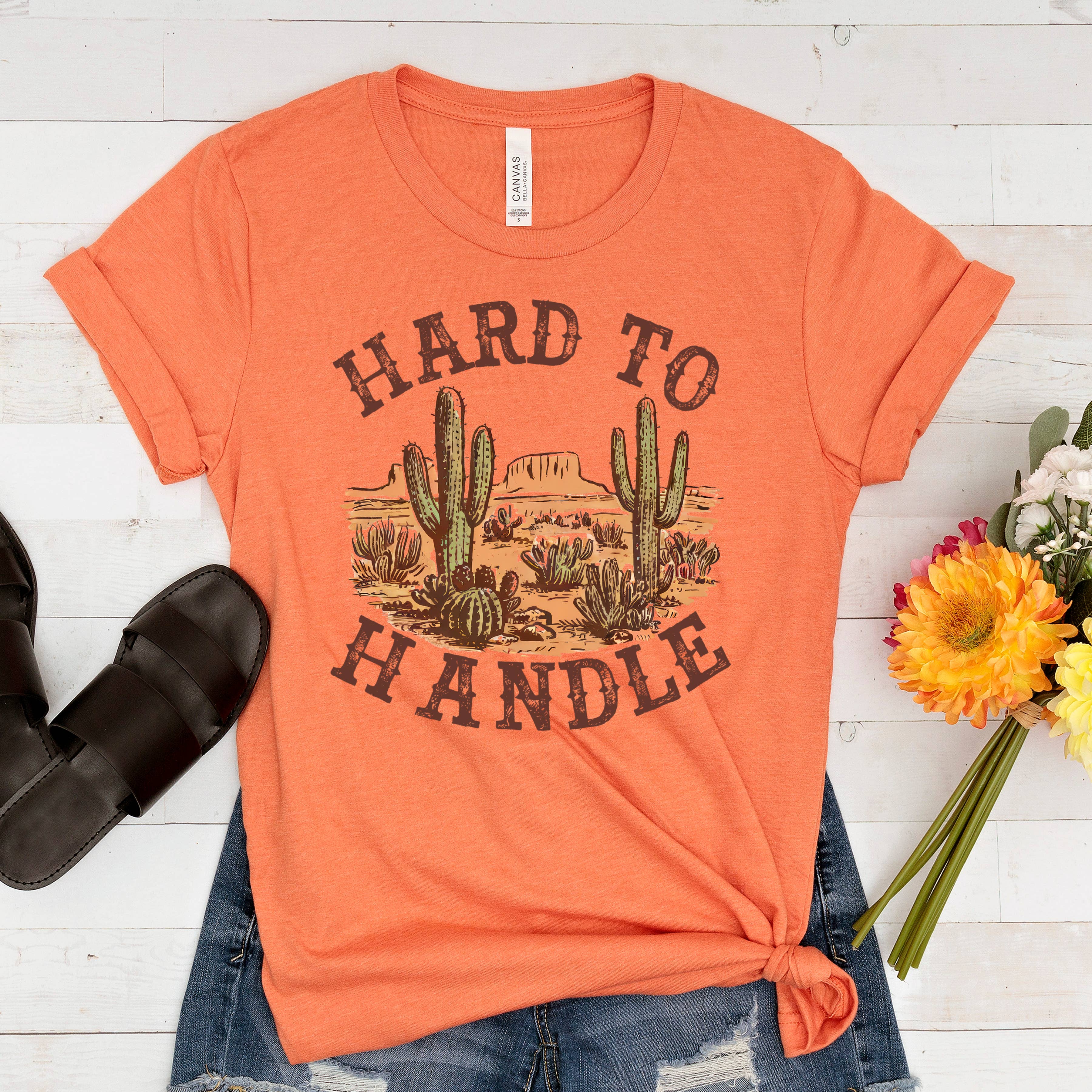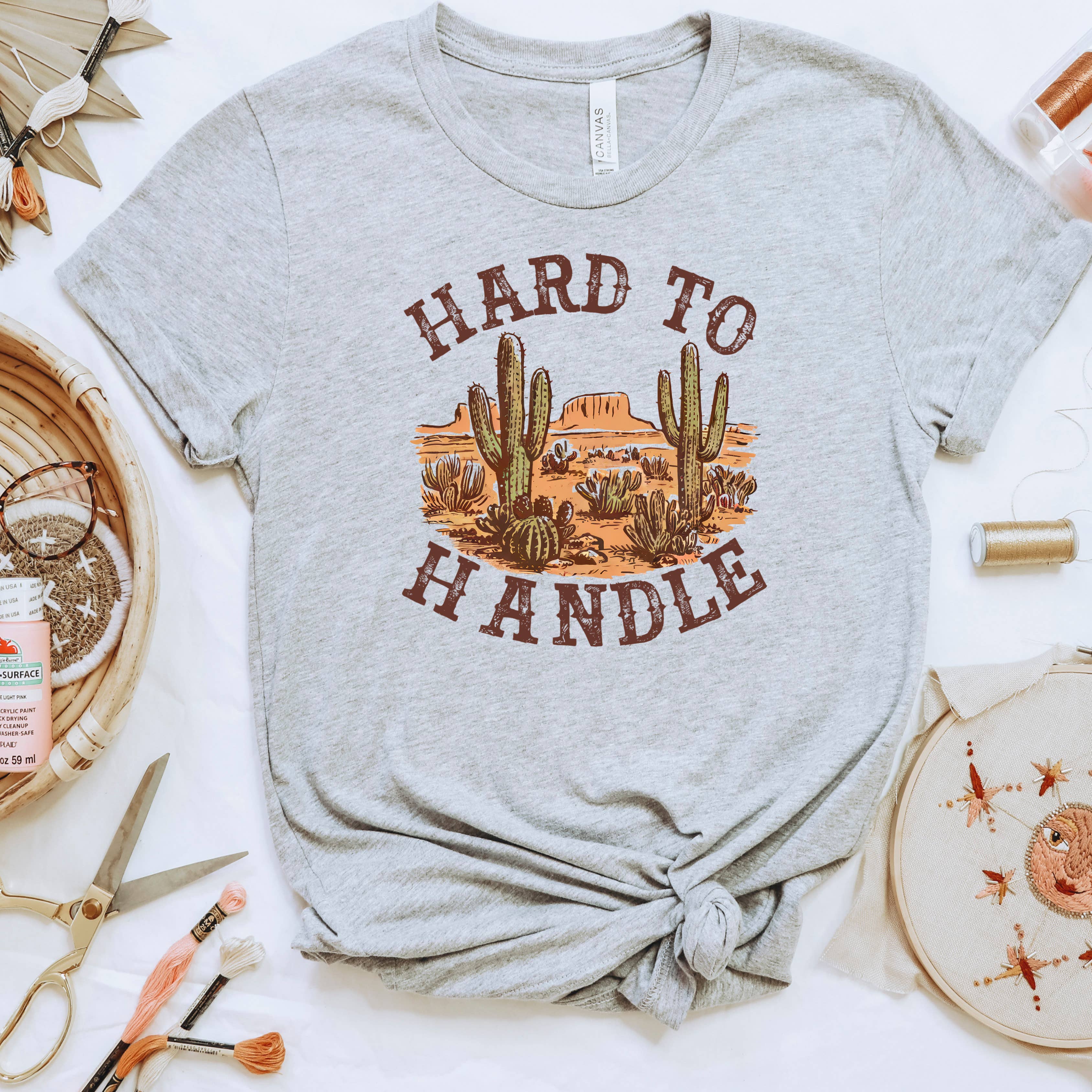 Elevate your boutique's western apparel collection with graphic tees western that capture the spirited essence of desert dreamers—this "Hard to Handle" design showcases a vintage-distressed saguaro cactus landscape with rustic typography that resonates with customers seeking authentic cowgirl attitude.