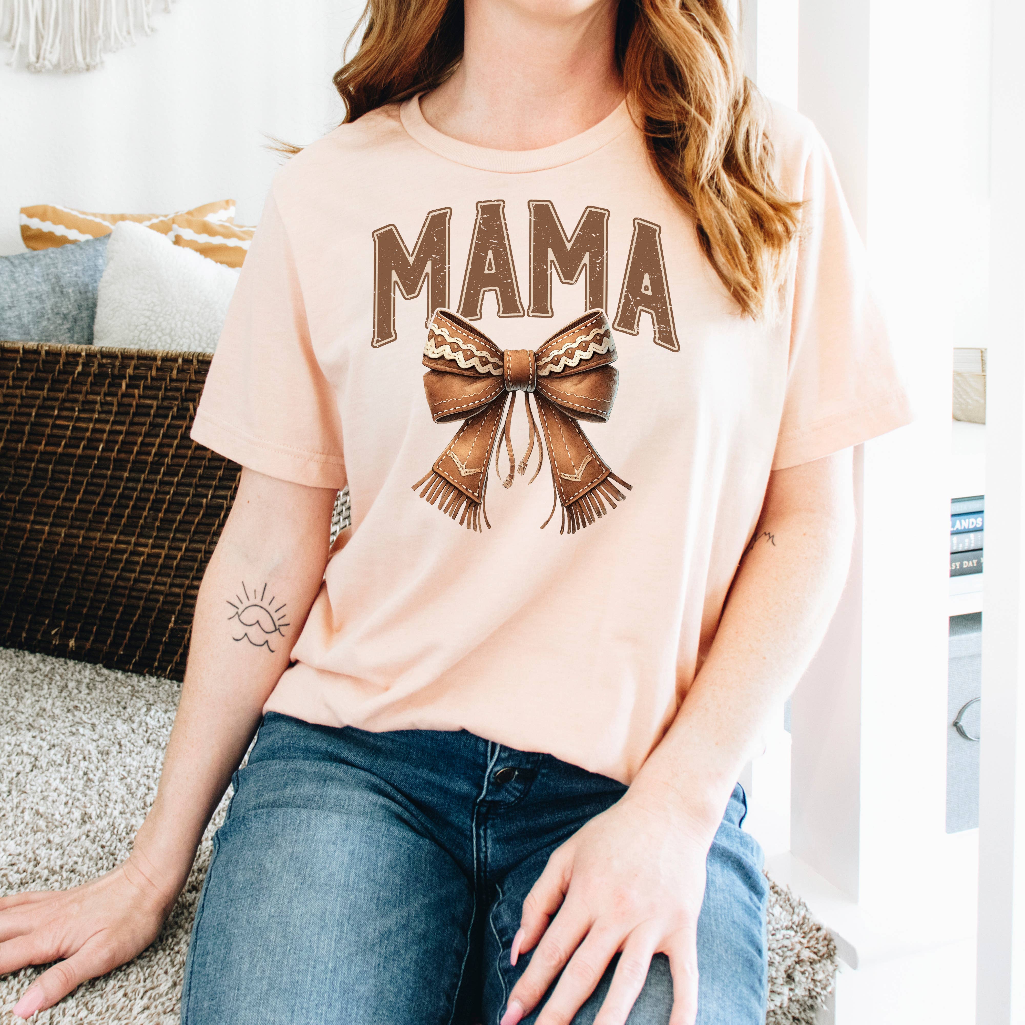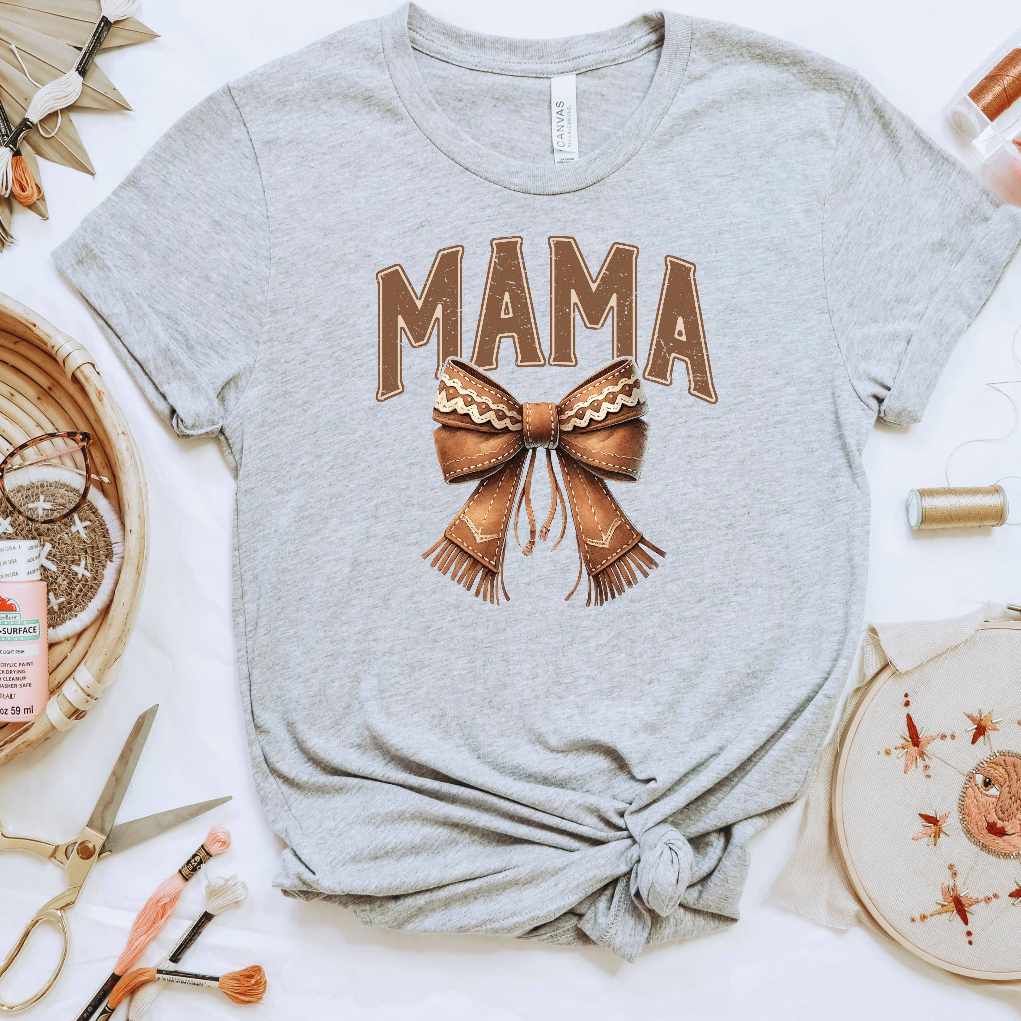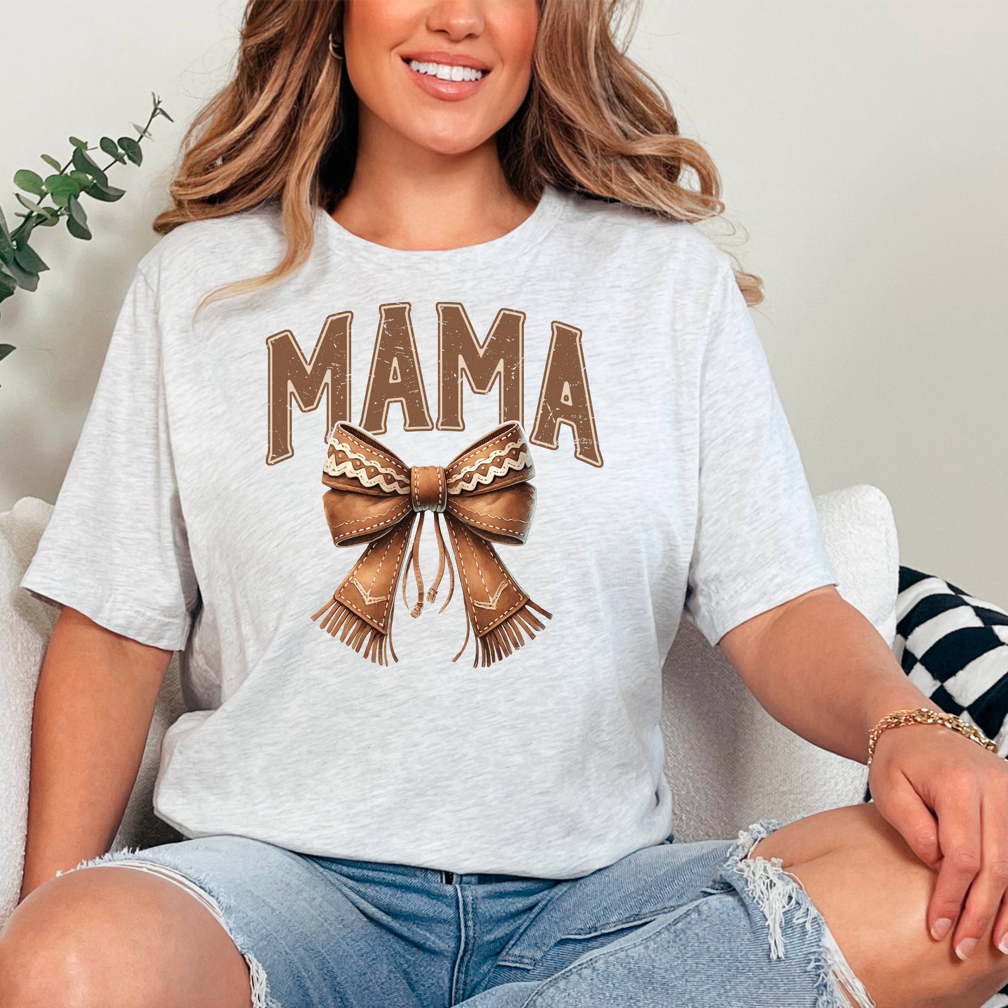 The "Coquette" bow trend gets a western makeover with this stunning "Mama" graphic tee. The design features bold, vintage-style typography paired with a hyper-realistic illustration of a leather bow, complete with western tooling details and fringe. This is the ultimate "Cool Mom" shirt for customers who love country fashion.
