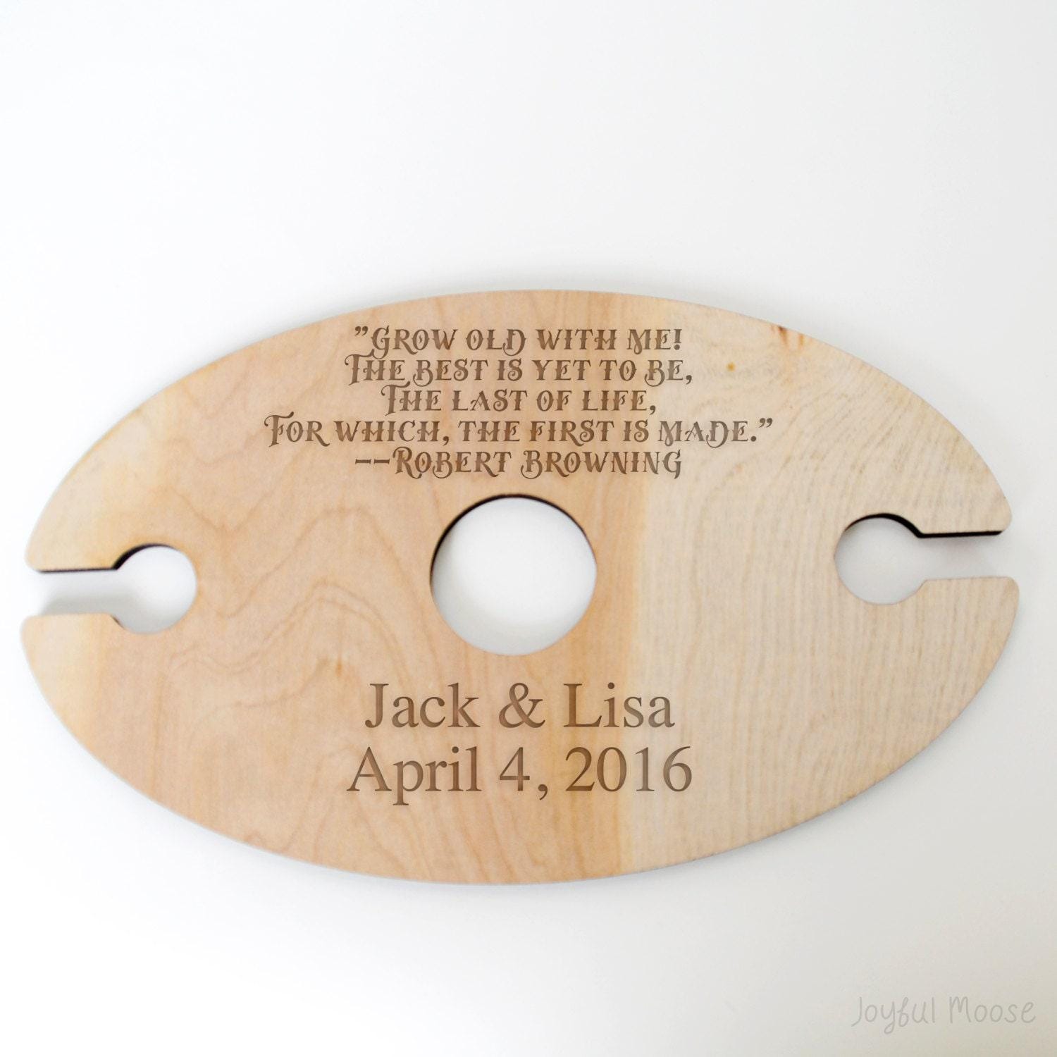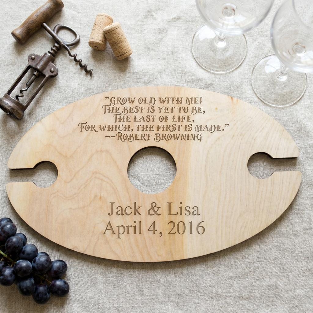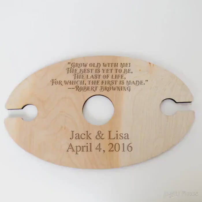 This personalized wood wine holder is a beautifully crafted accessory designed to securely hold two wine glasses over a standard wine or champagne bottle, making it the perfect romantic wine gift for weddings and anniversaries. Made from high-quality engraved wood veneer with a natural woodgrain finish, this engraved wine glass holder measures 10 inches by 6 inches with a slim 0.25-inch thickness, combining durability with lightweight elegance. Featuring an inspiring Robert Browning quote engraved in timeless script, it adds a heartfelt touch to any celebration.