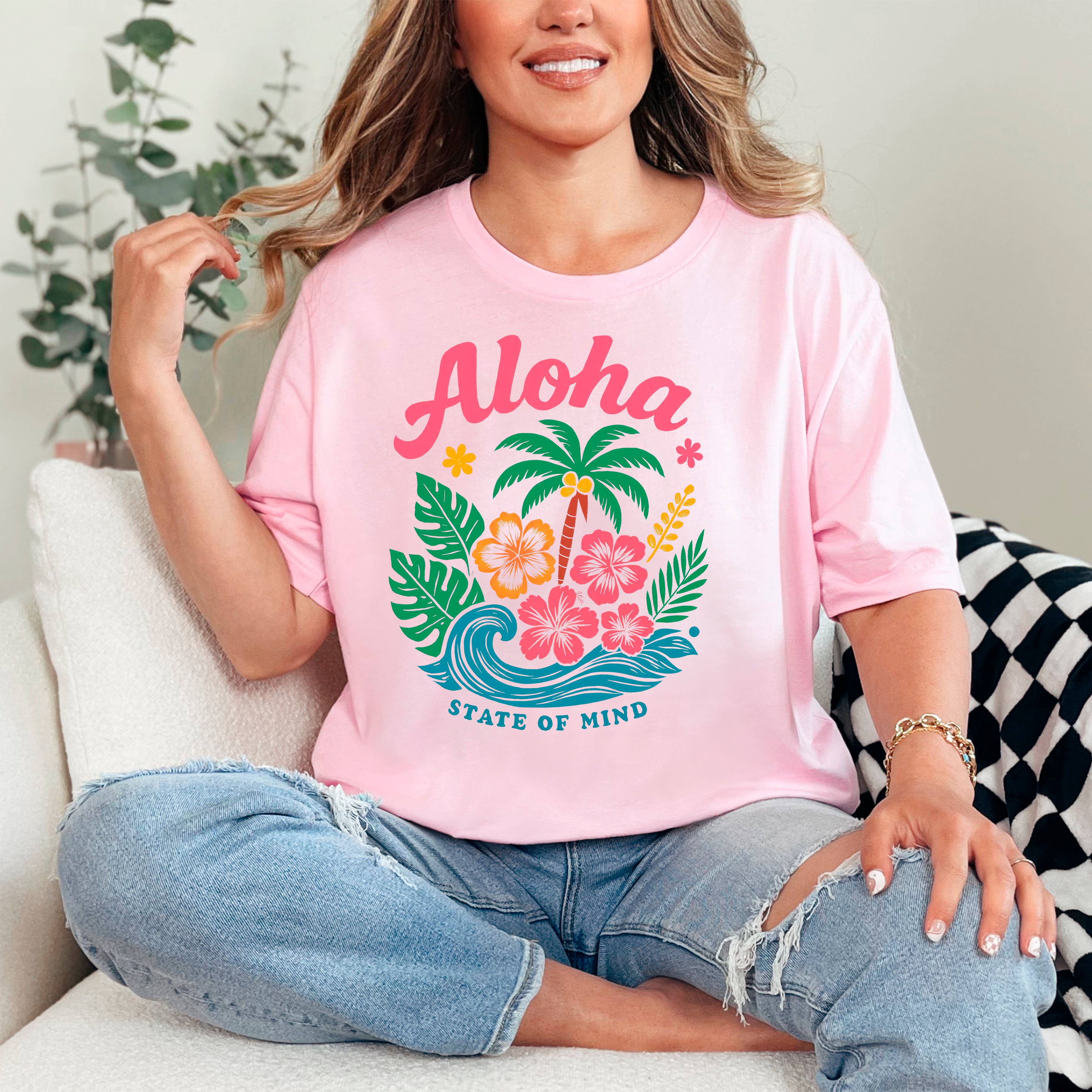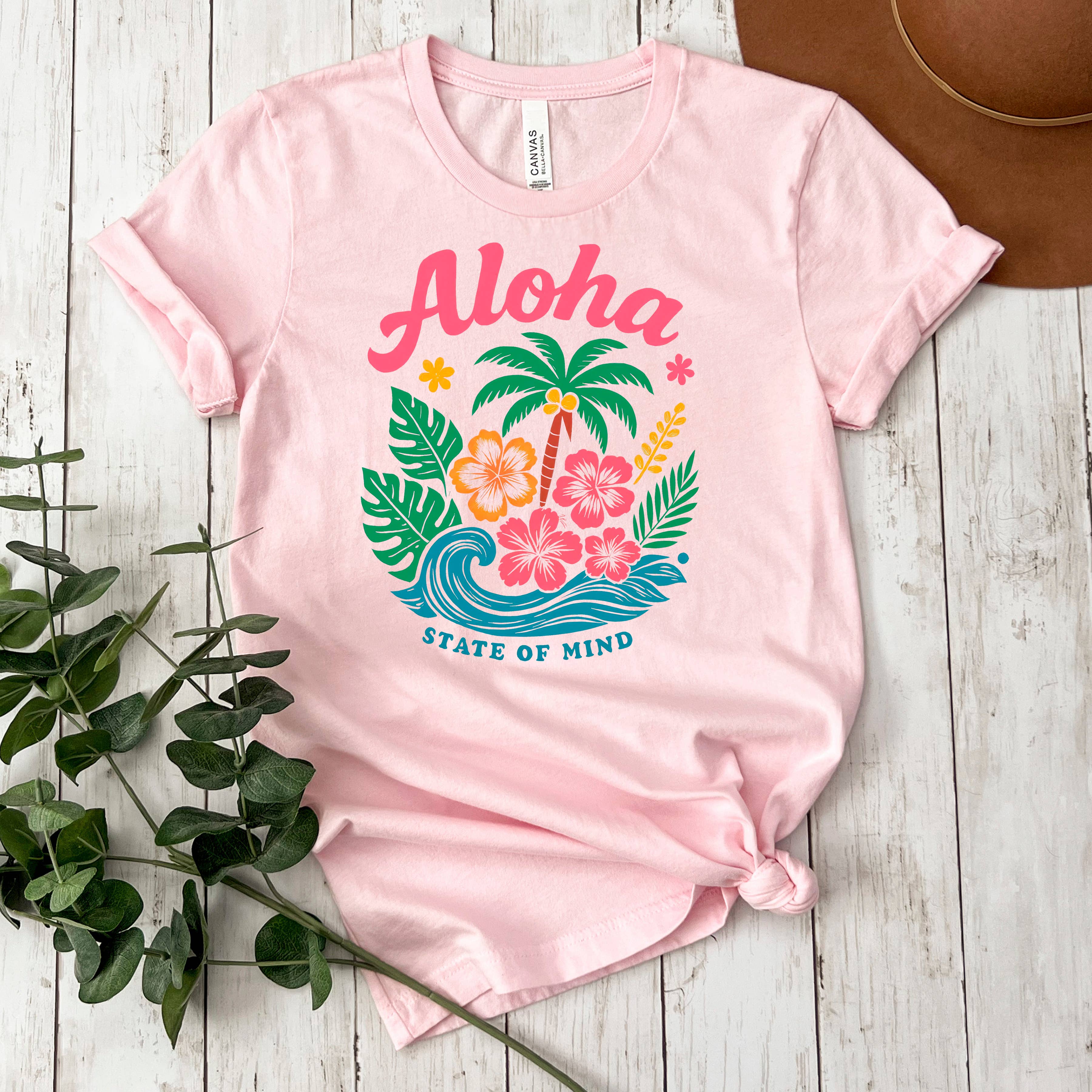 Design: "Aloha State of Mind" in retro script and sans-serif typography, surrounded by a colorful tropical bouquet (hibiscus, palm, waves).