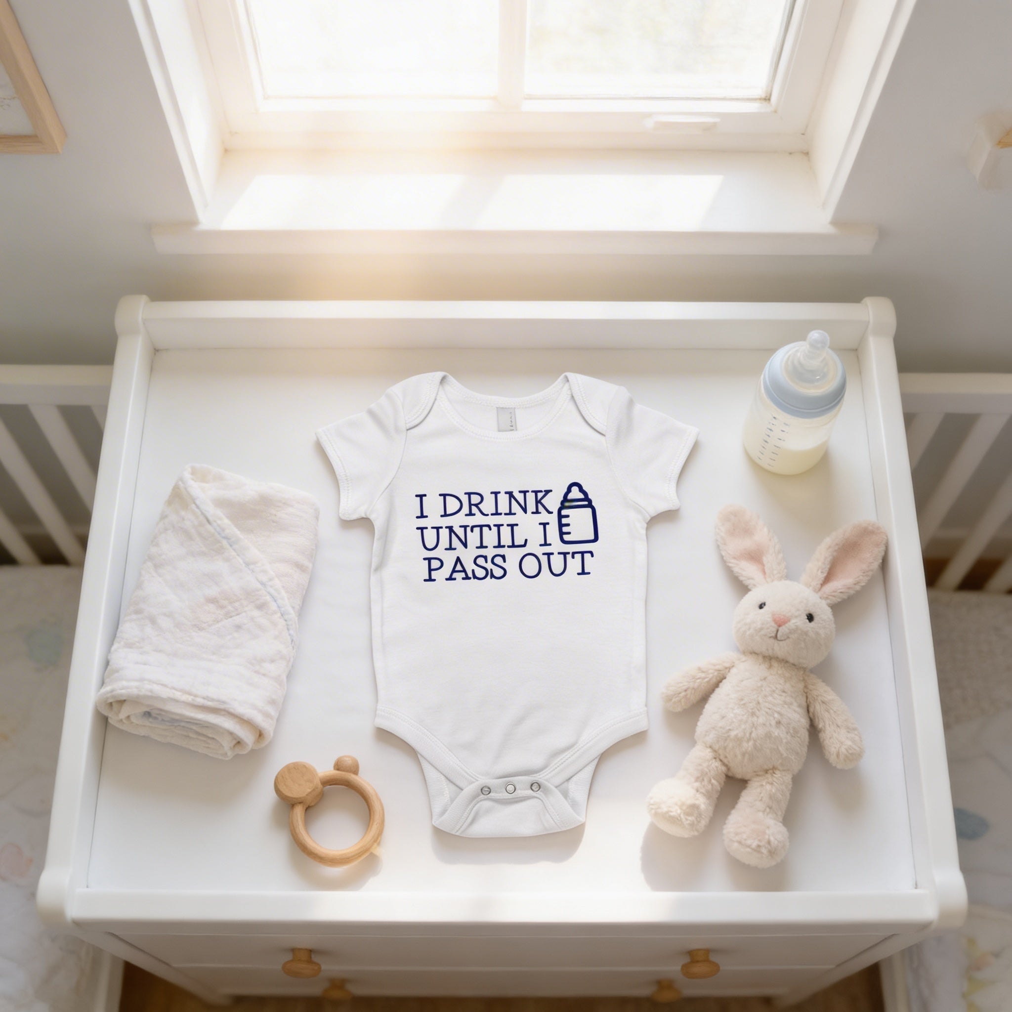 This humorous baby shirt proudly displays the playful phrase "I drink until I pass out with Baby Bottle," adding a touch of fun to your baby boy clothes collection. Available in sizes ranging from 0-3 months up to 12-18 months, this cute baby boy outfit grows with your toddler. You can choose between a short sleeve bodysuit or a long sleeve onesie, making it suitable for all seasons and occasions.