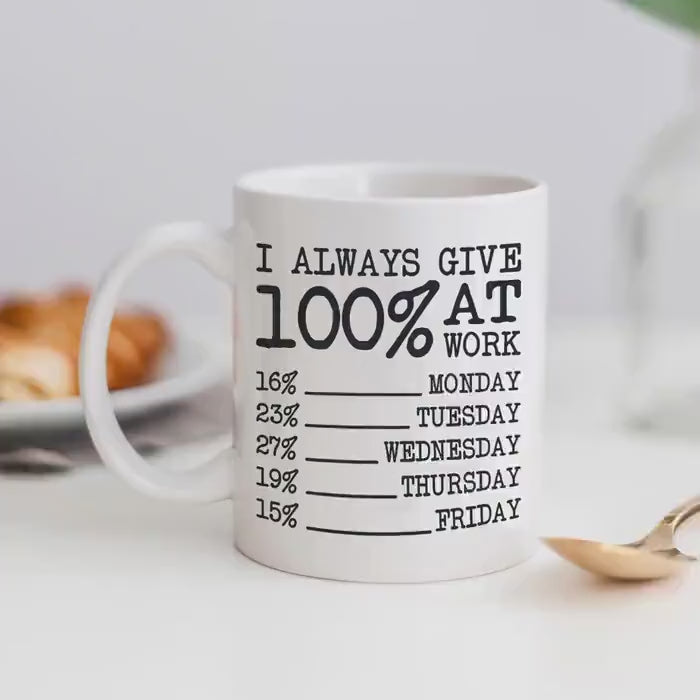 This funny coffee mug is the perfect way to add humor and personality to your daily routine while enjoying your favorite hot beverage. Made from high-quality ceramic, this ceramic coffee cup offers durability and long-lasting use, ensuring it stands up to everyday wear. Its large coffee mug size comfortably holds enough coffee, tea, or hot cocoa to keep you energized through busy workdays. Designed with witty workplace humor, the mug features a playful message that reads “I always give 100% at work,” breaking down the percentages for each day of the week—a clever touch that makes it an ideal office coffee mug and coworker gag gift.