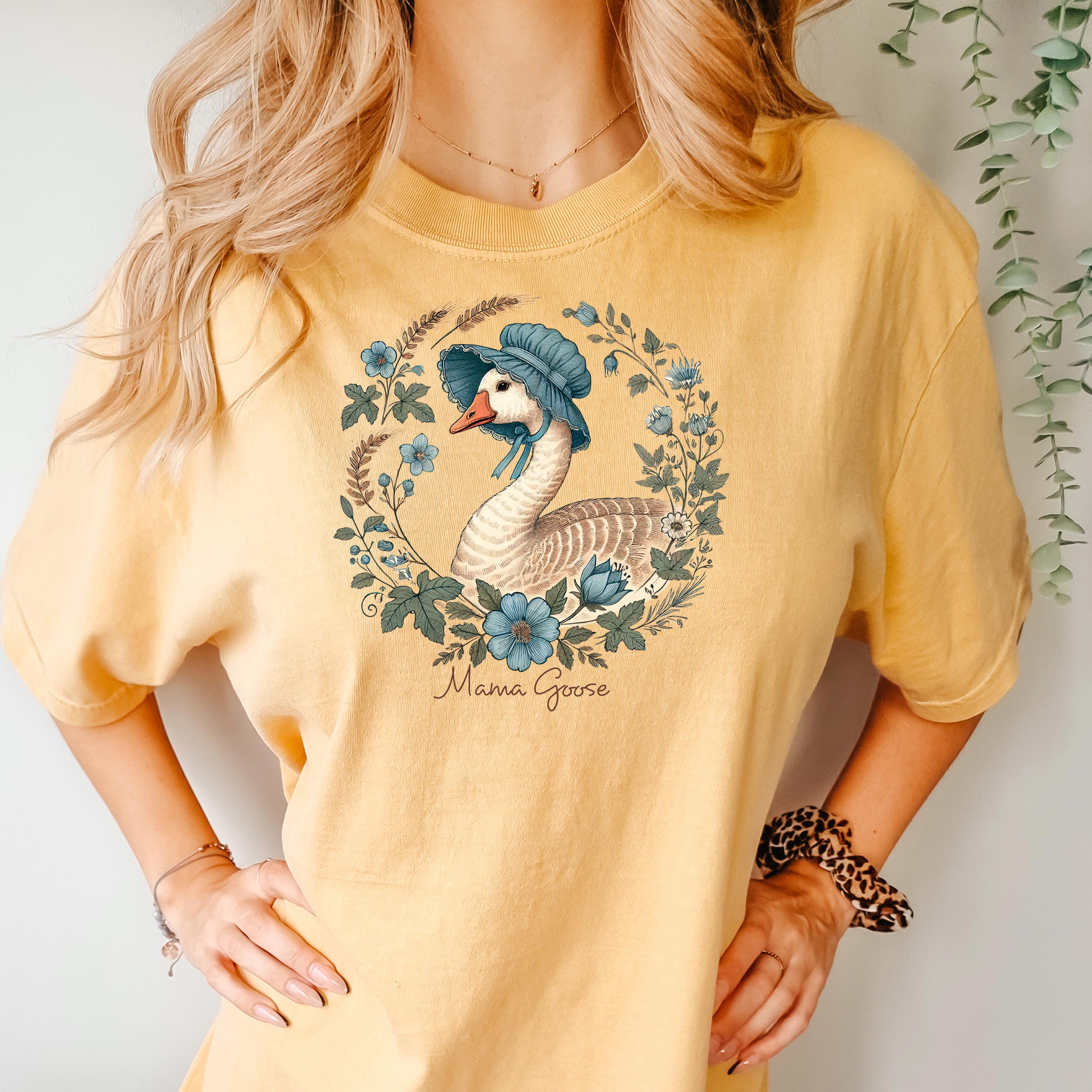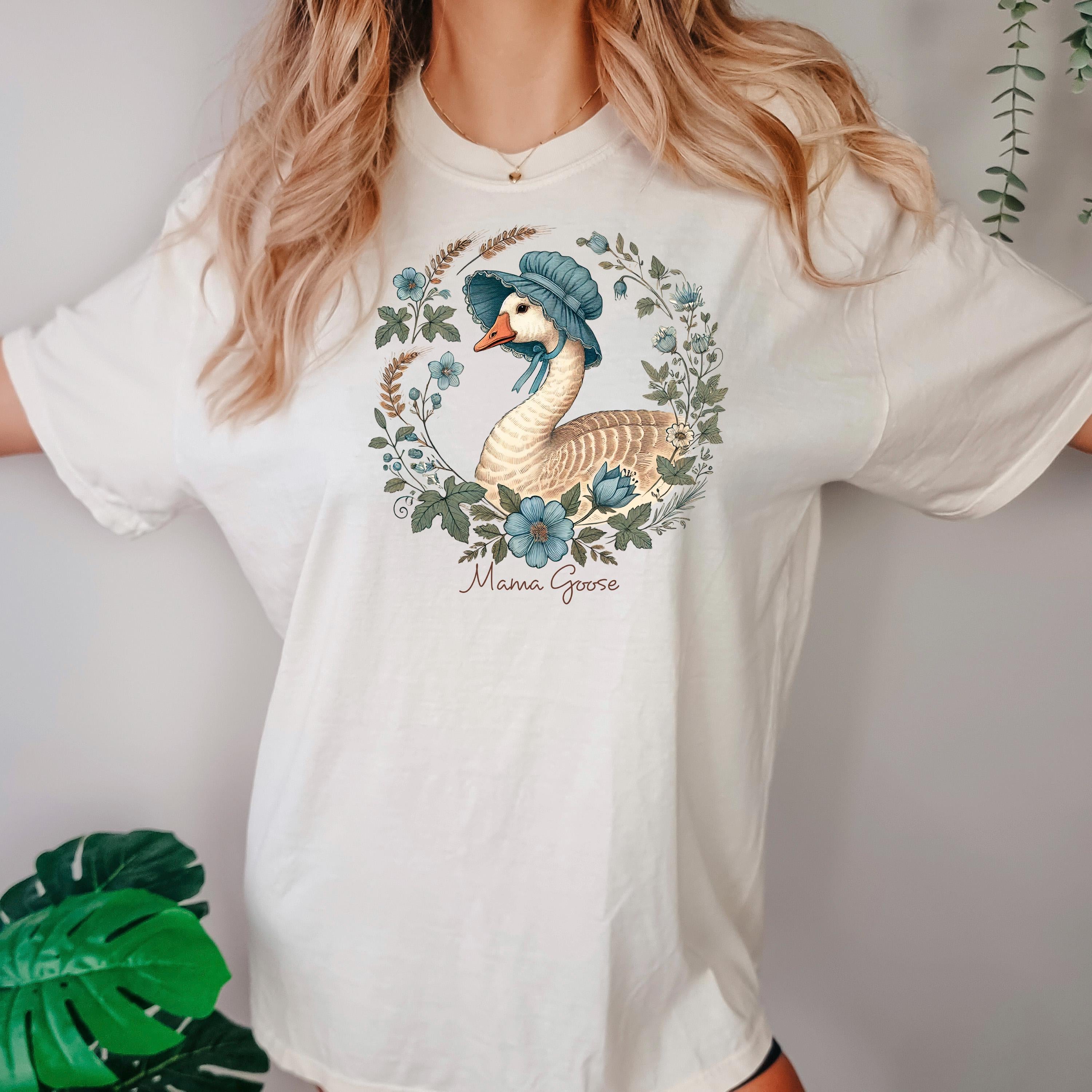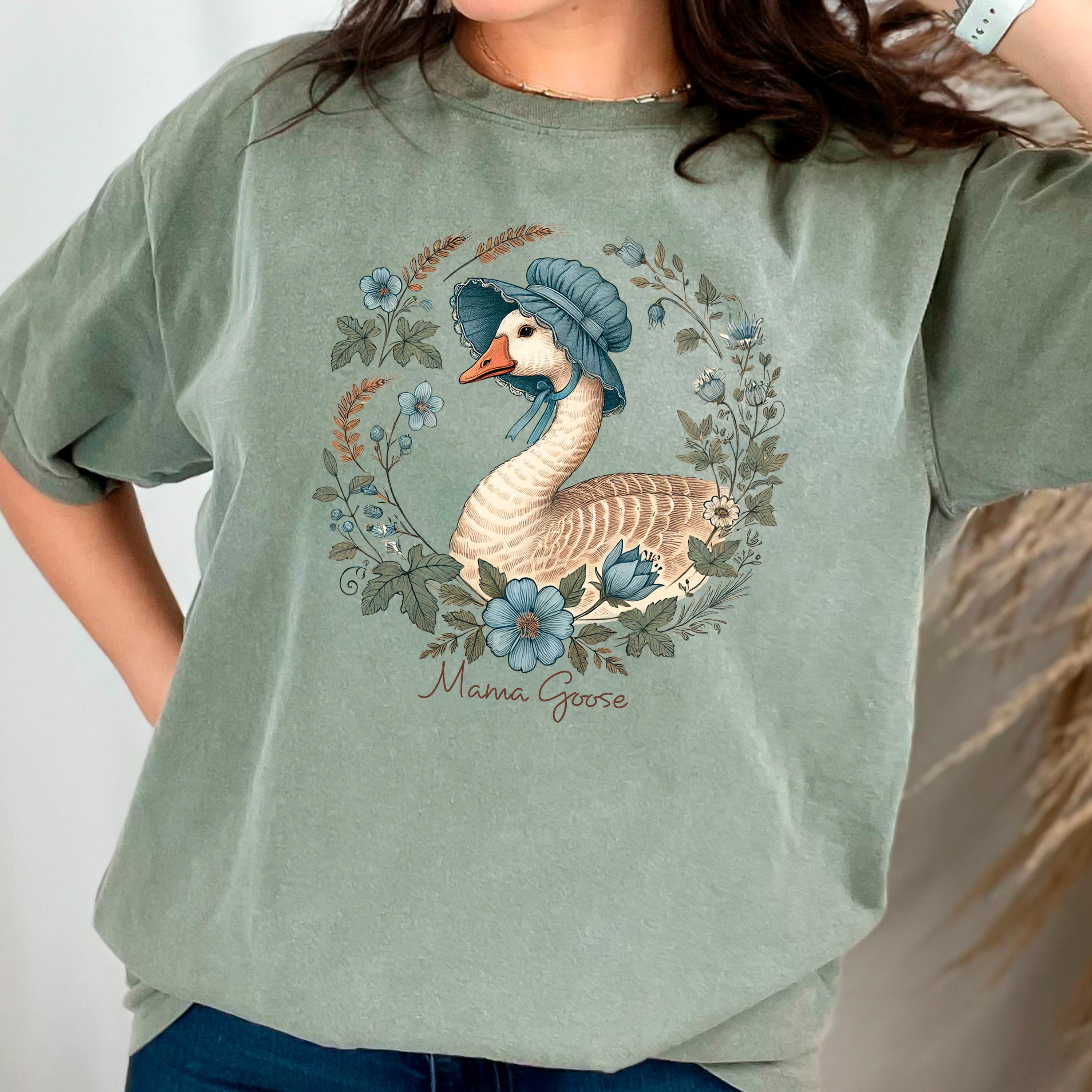 The Mama Goose T-Shirt is a cozy and stylish comfort colors tee designed to bring vintage charm and playful cottagecore vibes to your wardrobe. Made from 100% soft washed cotton, this pre-shrunk cotton tee offers a relaxed fit shirt that keeps you comfortable all day. Featuring an exclusive floral bonnet tee design with a beautifully illustrated goose wearing a bonnet surrounded by delicate florals, this vintage goose shirt is perfect for animal lovers and anyone who appreciates pastel aesthetic tops and cottagecore shirts.
