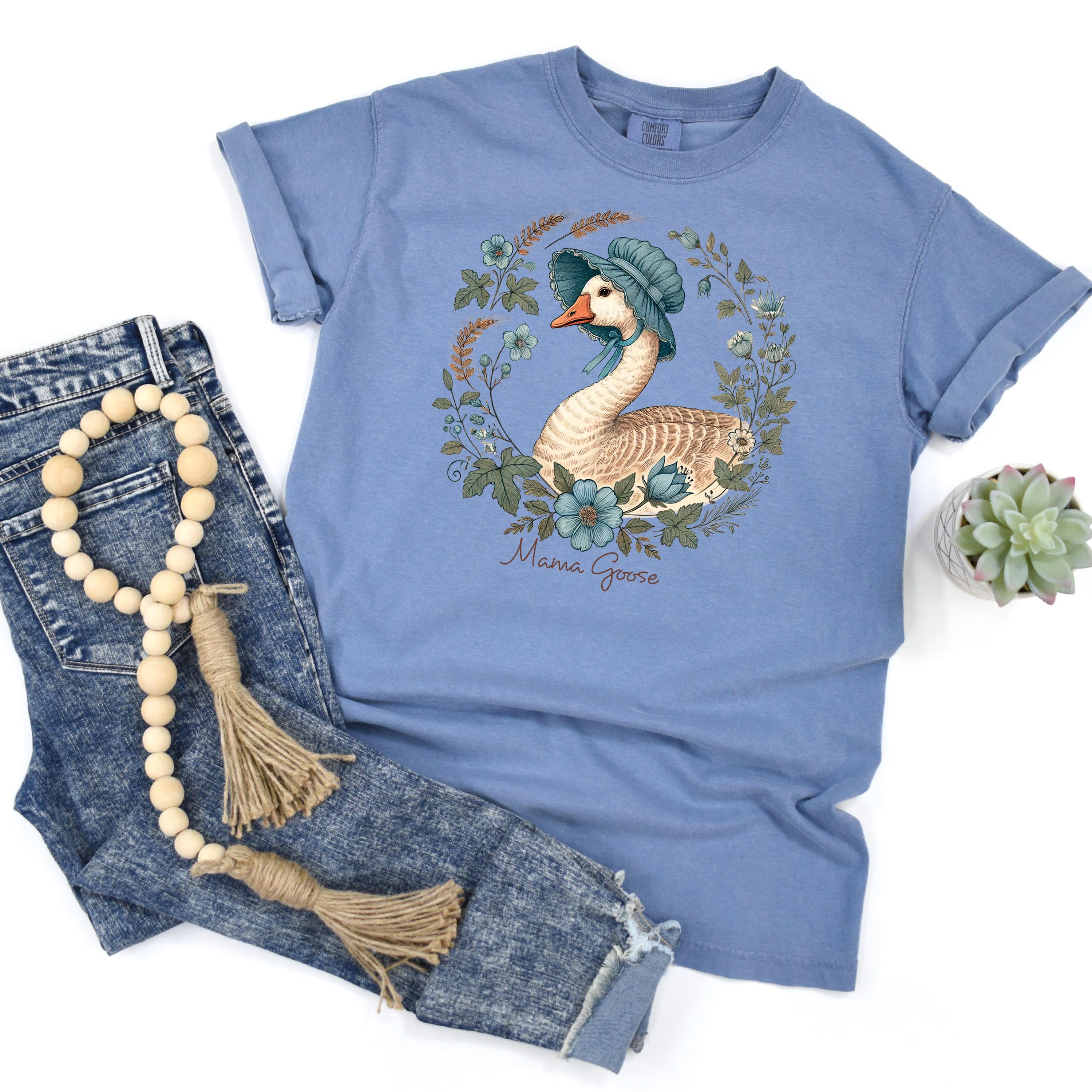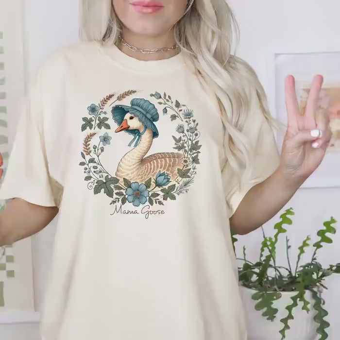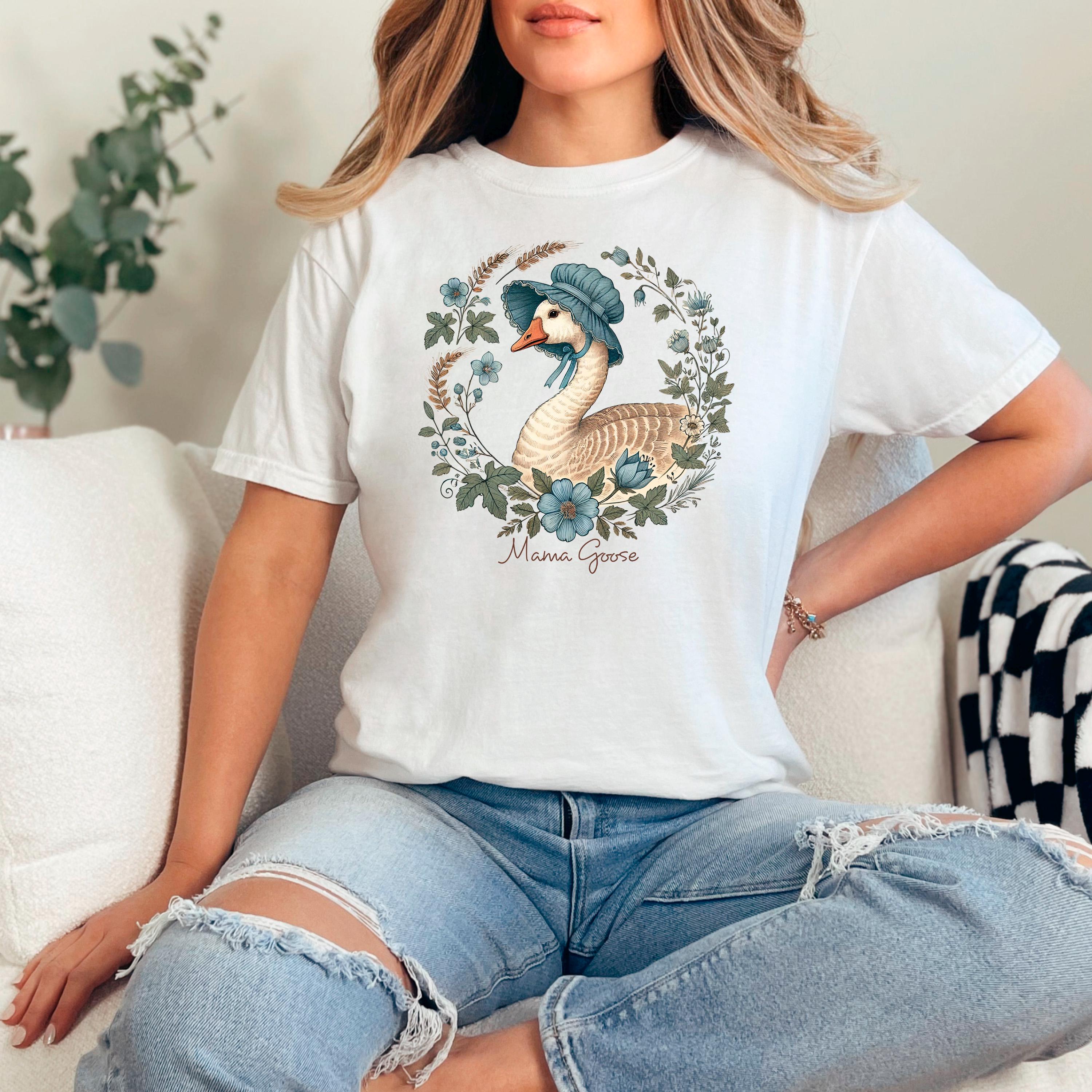The Mama Goose T-Shirt is a cozy and stylish comfort colors tee designed to bring vintage charm and playful cottagecore vibes to your wardrobe. Made from 100% soft washed cotton, this pre-shrunk cotton tee offers a relaxed fit shirt that keeps you comfortable all day. Featuring an exclusive floral bonnet tee design with a beautifully illustrated goose wearing a bonnet surrounded by delicate florals, this vintage goose shirt is perfect for animal lovers and anyone who appreciates pastel aesthetic tops and cottagecore shirts.