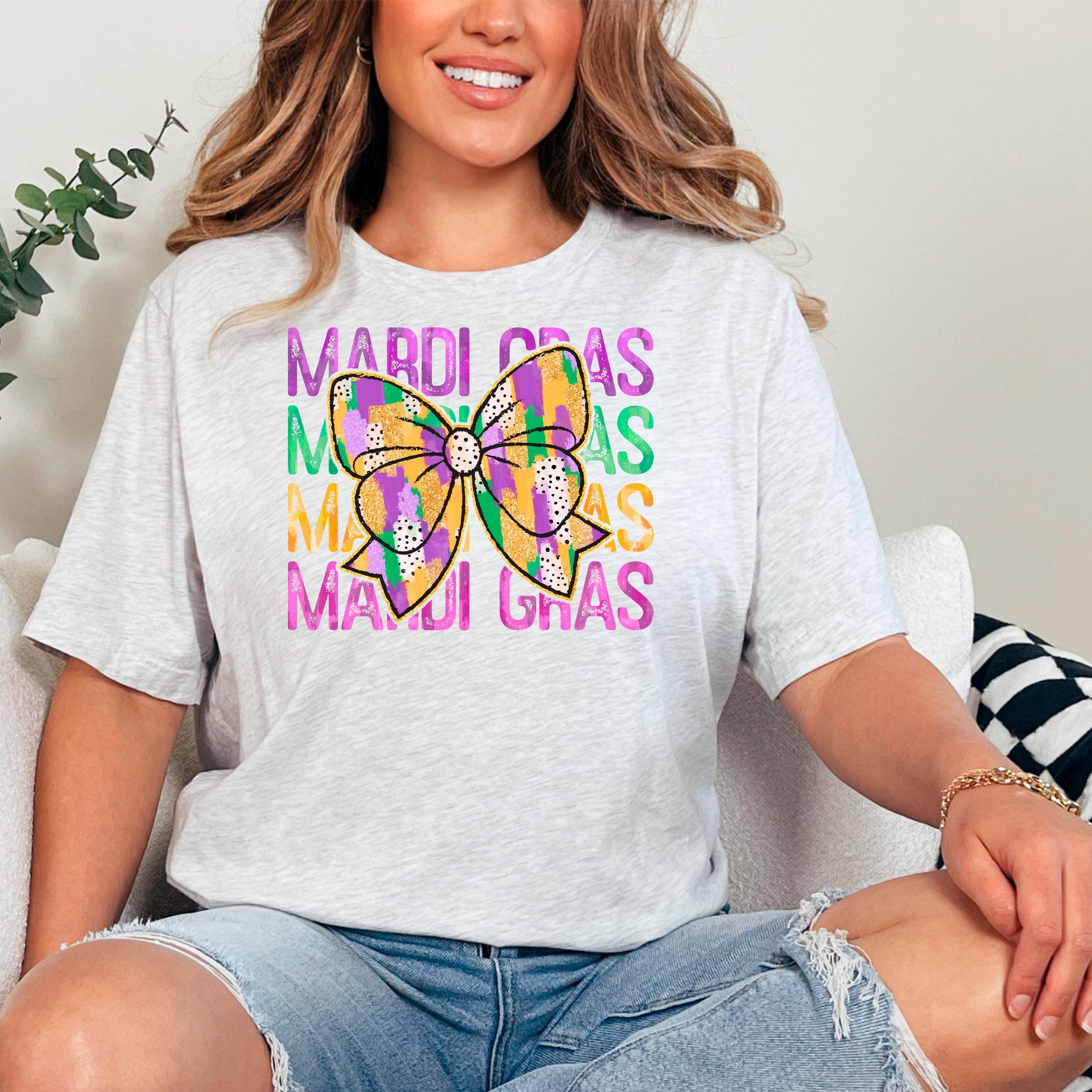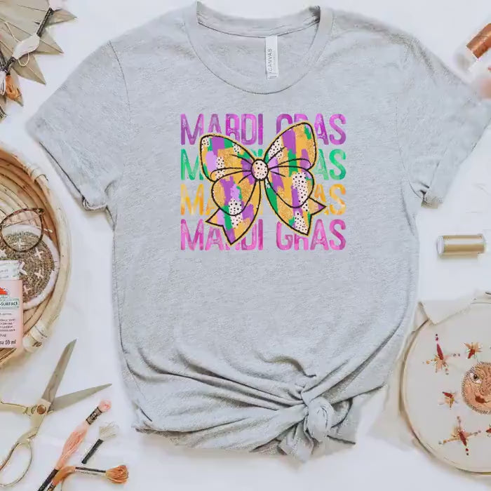 - Bold graphic coquette bow design paired with festive "Mardi Gras" text for a standout look