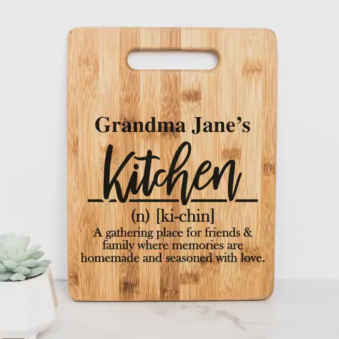 This personalized bamboo cutting board is the perfect grandma kitchen gift that combines practicality with heartfelt sentiment. Crafted from durable, eco friendly bamboo, this custom chopping board measures 8.75 x 11.5 inches, providing ample space for everyday meal prep while serving as a unique kitchen sign. The professionally printed design features a warm kitchen definition and can be personalized with a custom name and optional "Grandma" inscription, making it a truly one-of-a-kind wooden kitchen board. Tested for longevity and easy care, this engraved kitchen decor withstands regular use when hand washed gently.