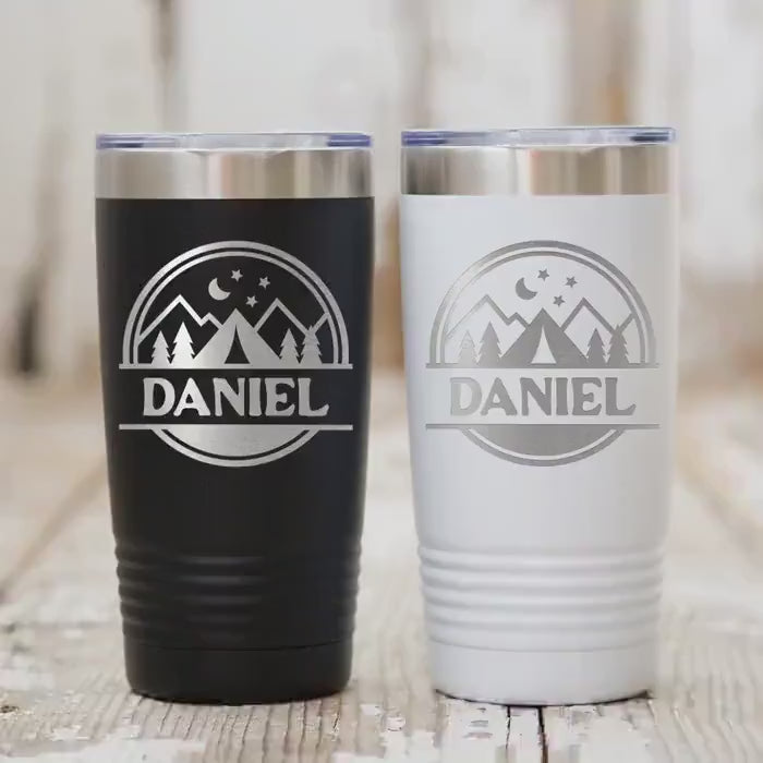 This personalized camping tumbler is a 20 oz insulated travel mug designed to keep your drinks hot or cold for hours during outdoor adventures. Crafted from durable stainless steel, this vacuum insulated tumbler features double-wall insulation that ensures your coffee stays steaming hot or your water refreshingly cold throughout camping trips, hikes, or any outdoor activity. The mountain stars design engraved on the stainless steel cup adds a rugged charm, while the option to add a custom name tumbler personalization makes it a unique gift for campers and outdoor lovers alike.