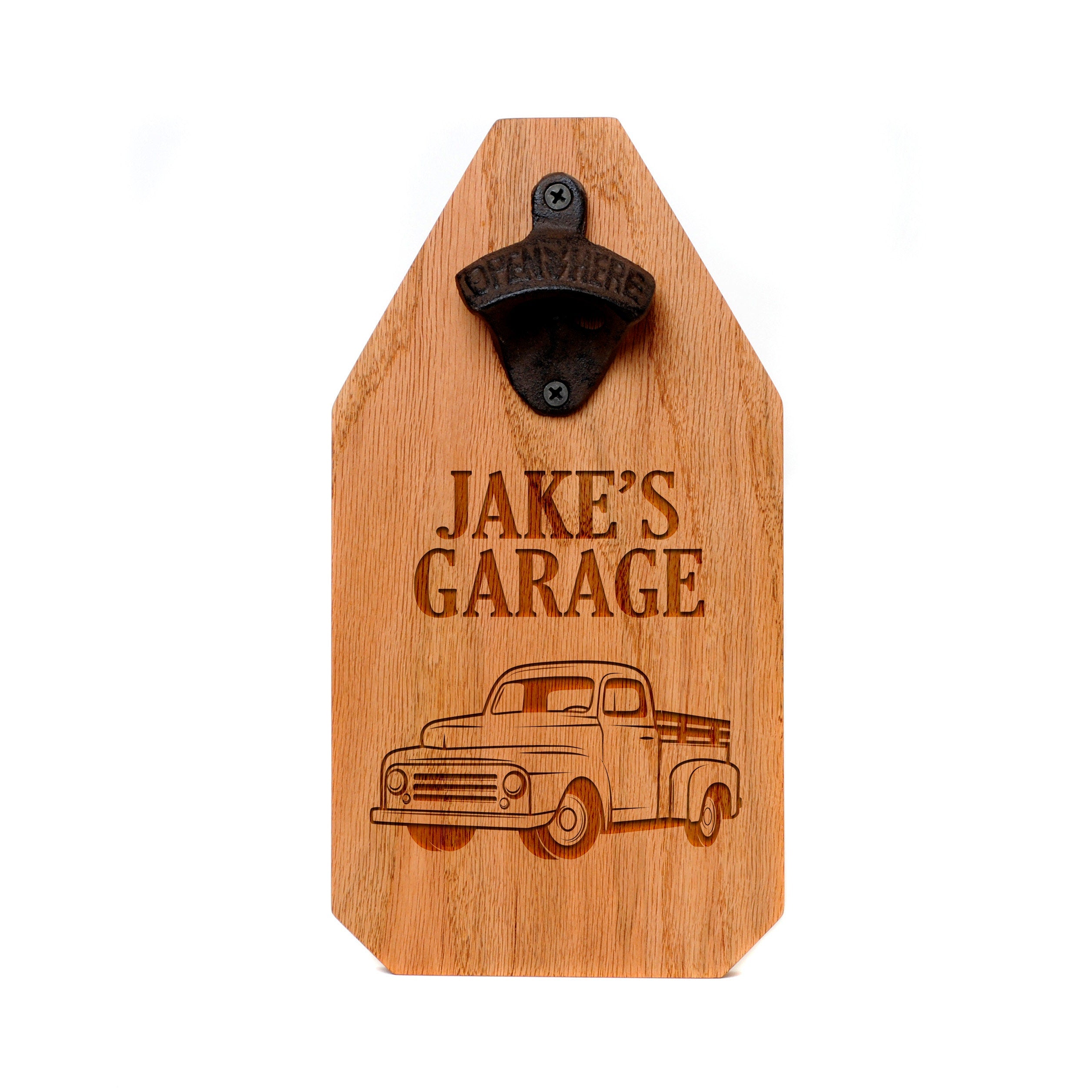 This personalized garage sign combines rustic charm with practical function, making it an ideal addition to any garage or man cave. Crafted from high-quality, laser-engraved wood, this custom garage sign features a vintage truck decor design and a built-in bottle opener, delivering both style and convenience. Measuring approximately 12 inches by 5.5 inches with a sturdy 0.75-inch thickness, this wood garage sign is perfect for adding a unique touch to your garage wall art while serving as a functional bottle opener sign.