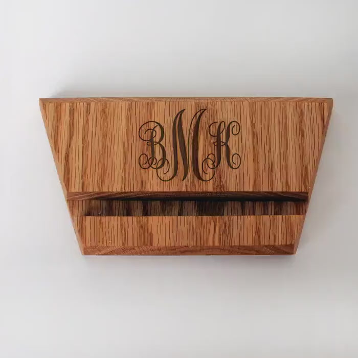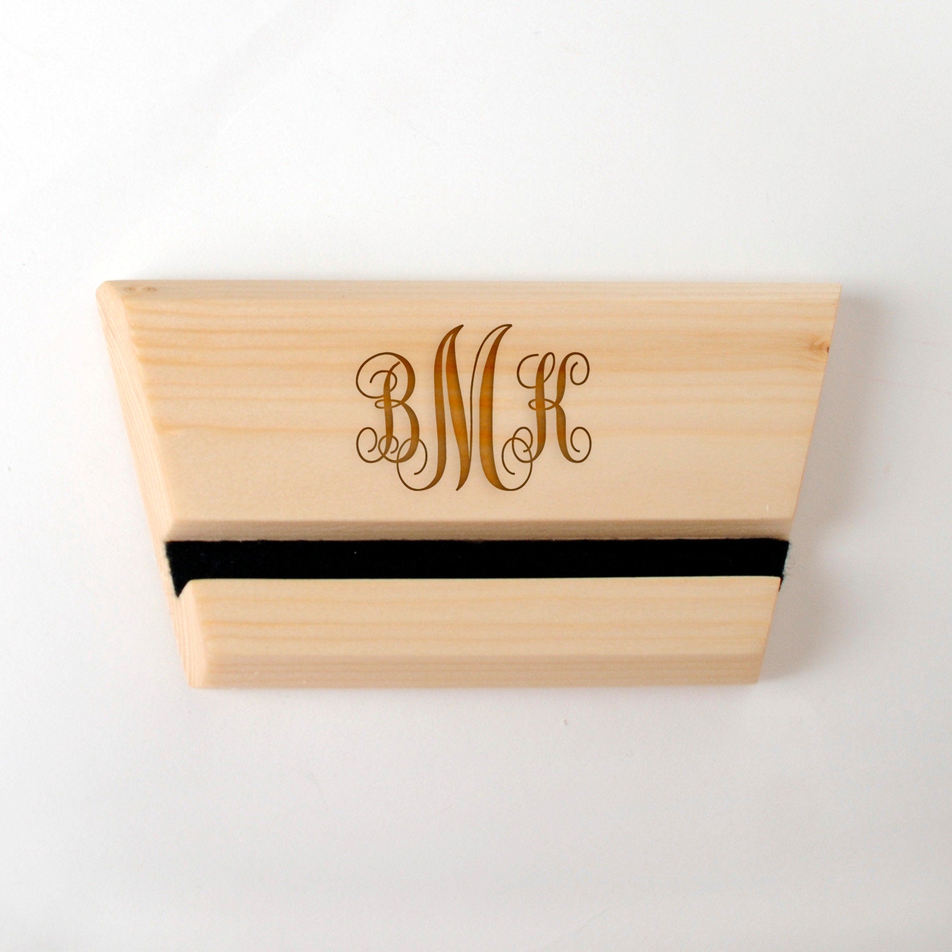 This wood ipad stand is a beautifully crafted Monogram Wood iPad Stand designed to hold full-size iPads, iPad minis, Kindles, and other tablets, providing a sturdy and stylish tablet holder that enhances your workspace or home. Made from premium pine or hardwood oak, this engraved wood stand offers a compact size of approximately 7 inches by 3.5 inches by 0.75 inches, with a 1/2 inch wide slot designed for an optimal viewing angle. The custom monogram stand adds a personalized touch, making it both a functional charging station dock and an elegant desk accessory.